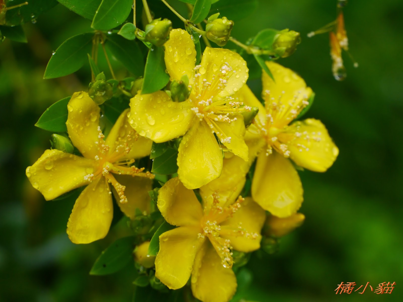 方莖金絲桃花.難怪我沒有看過.帶著雨滴的花瓣.看起來感覺更美!