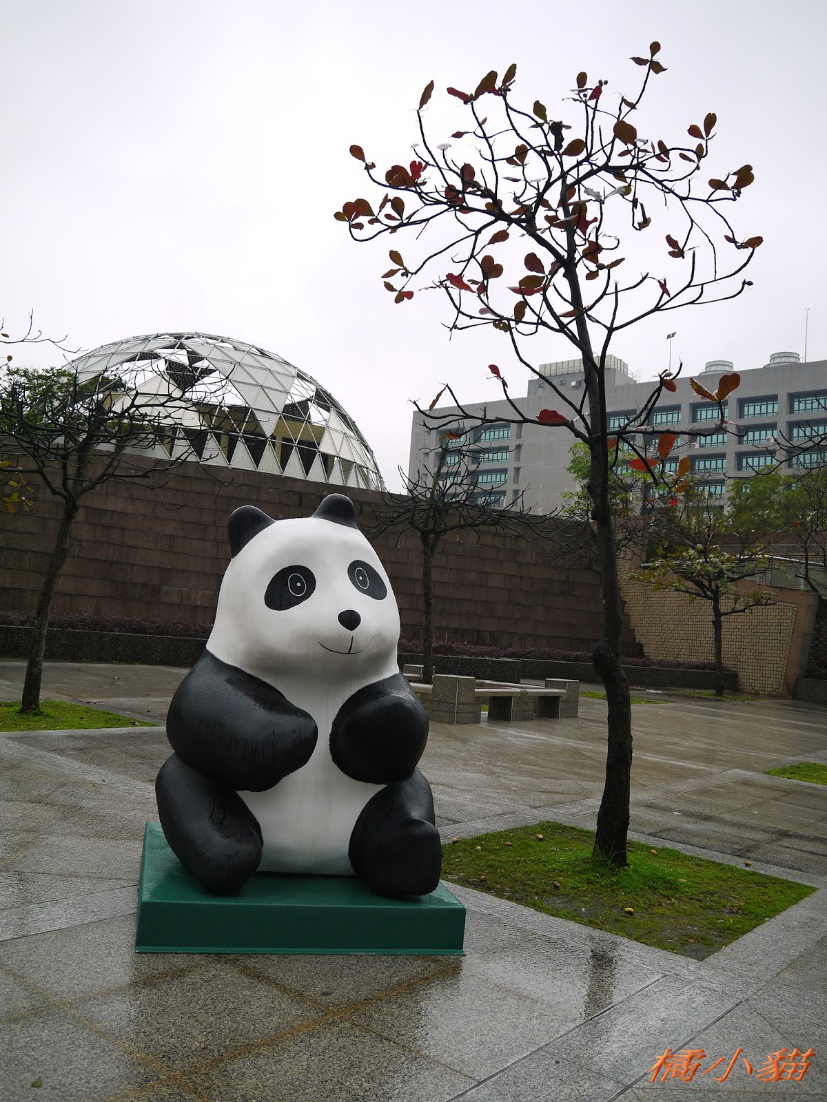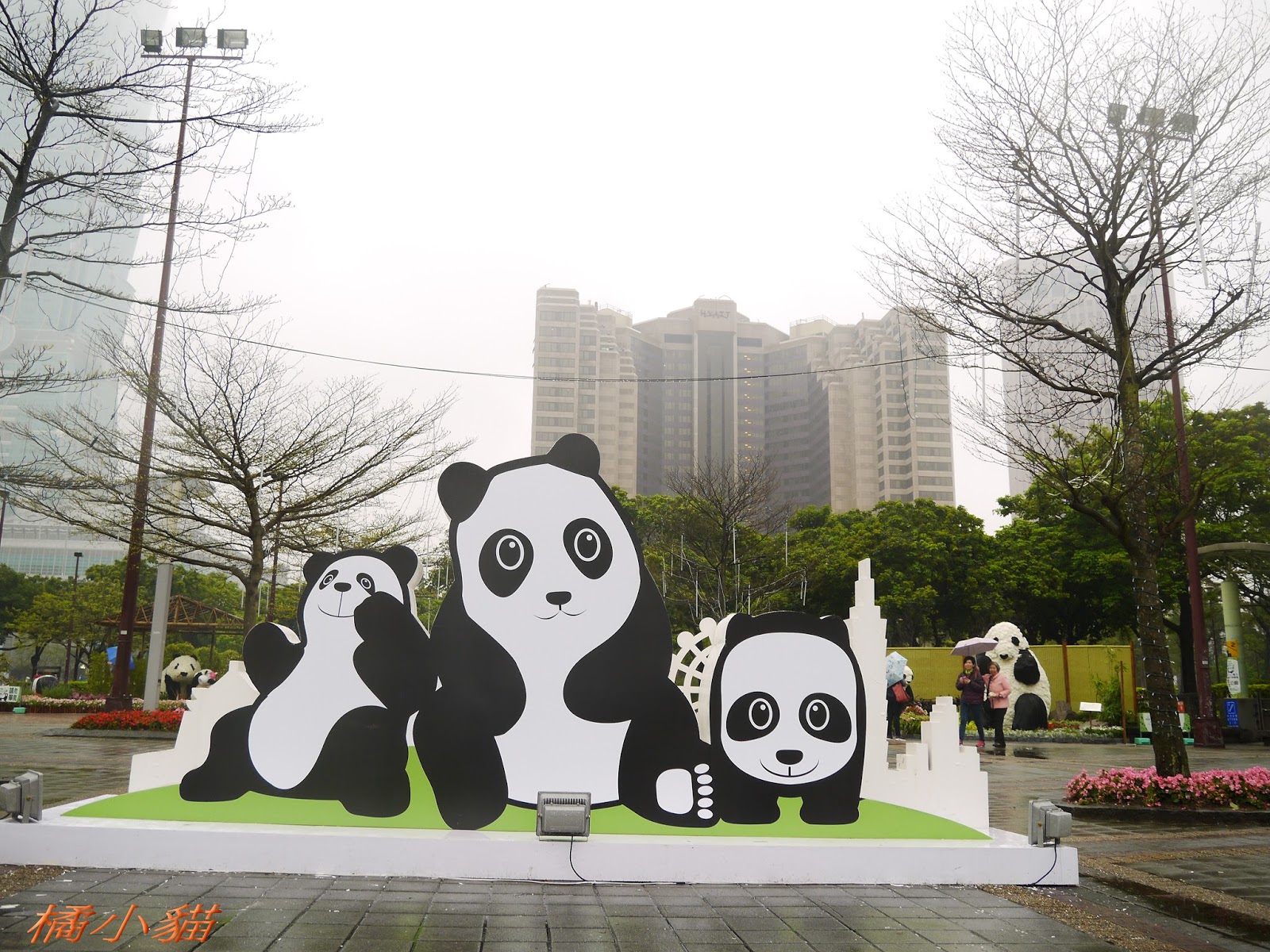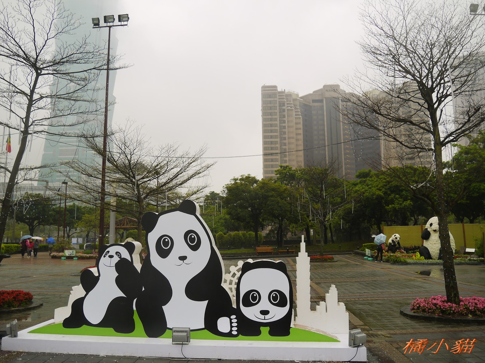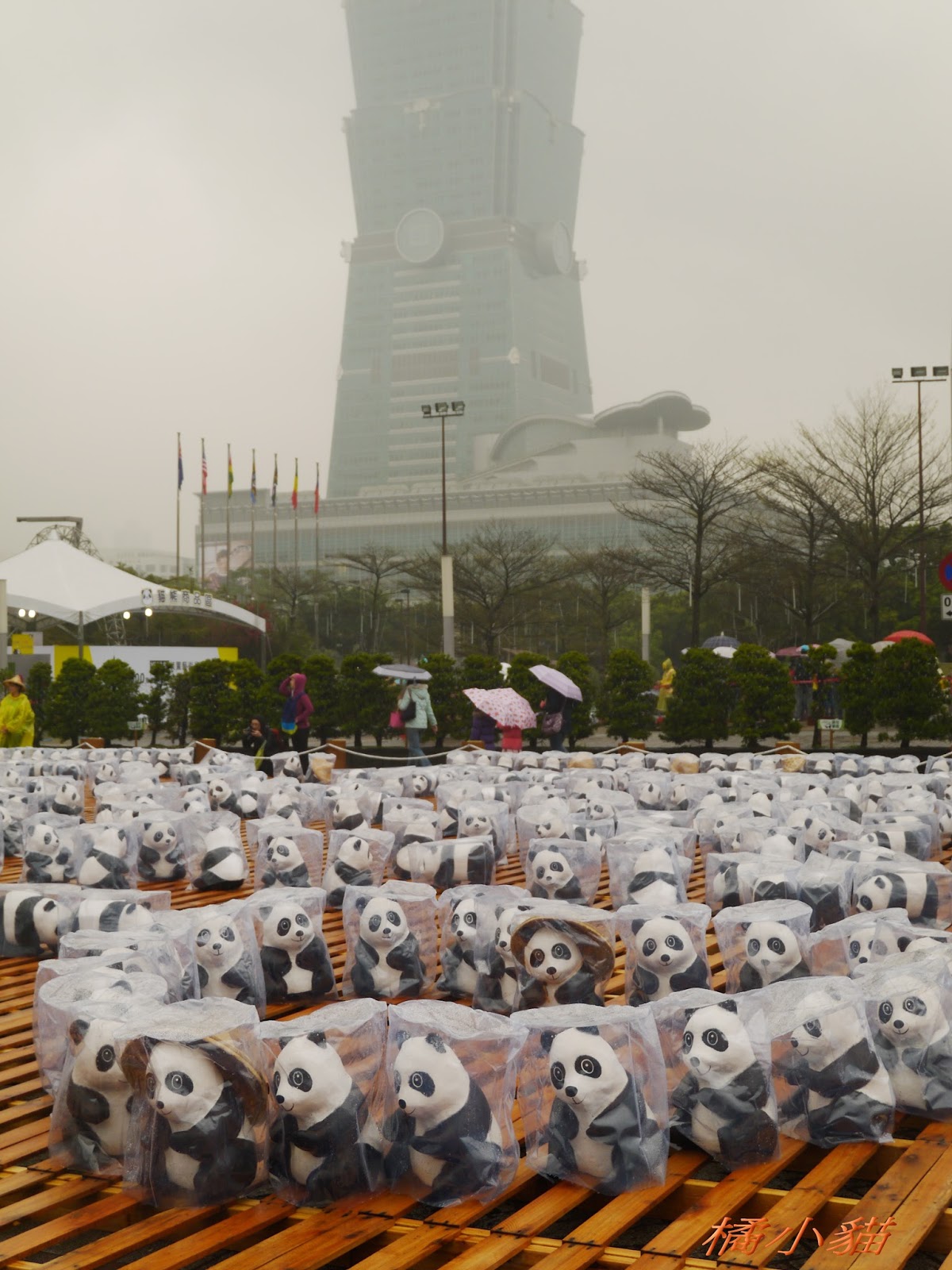 1600隻紙熊貓戴著雨衣展出真是創舉 小葉欖仁樹沒葉子照得很有意境很美!推~~~