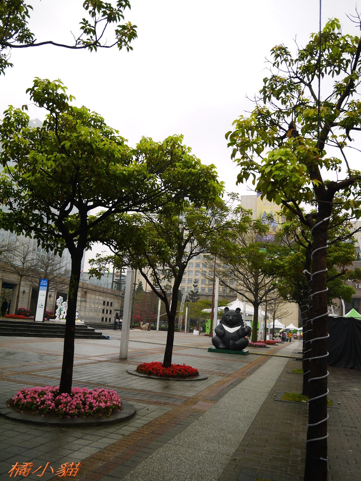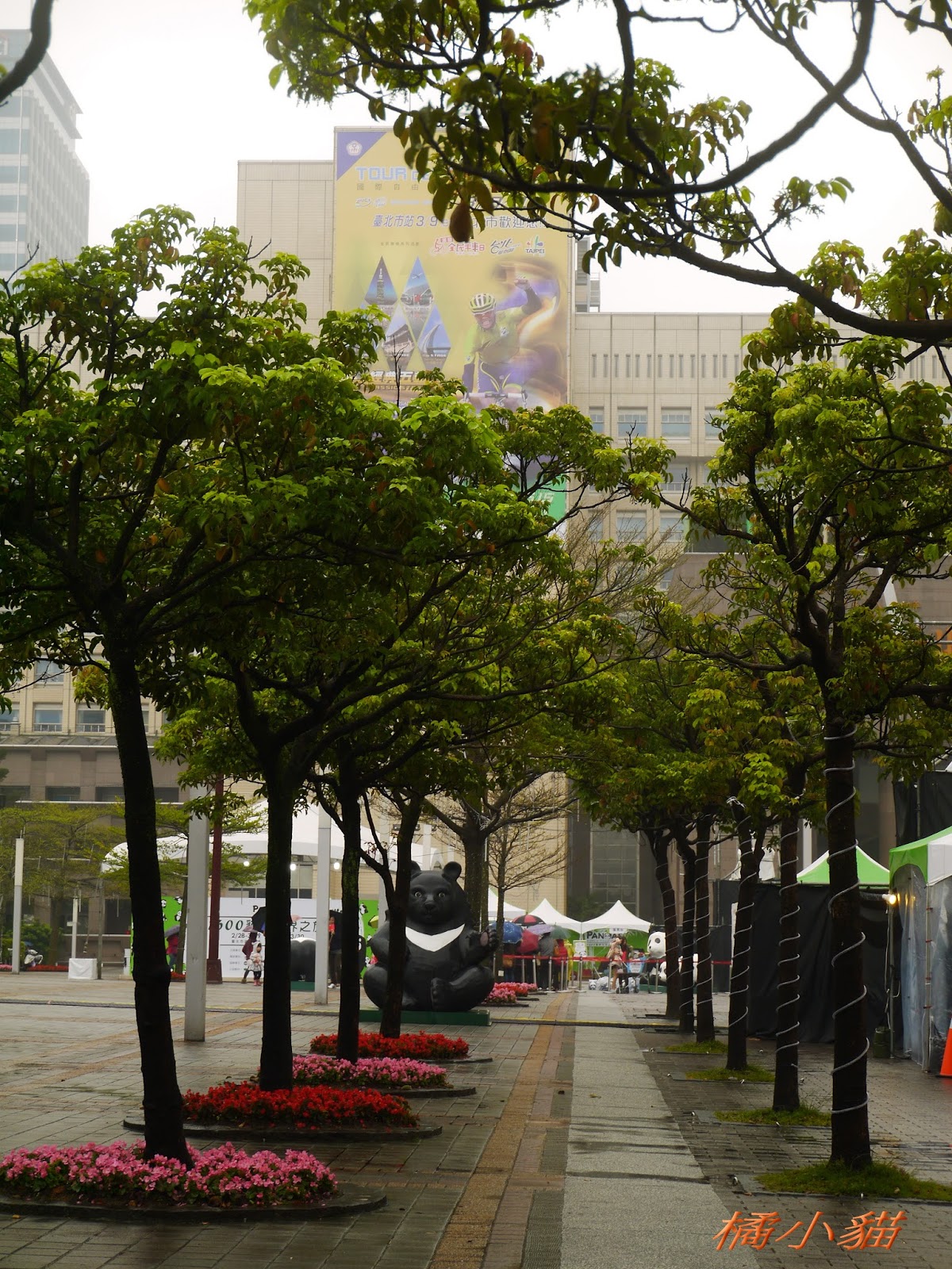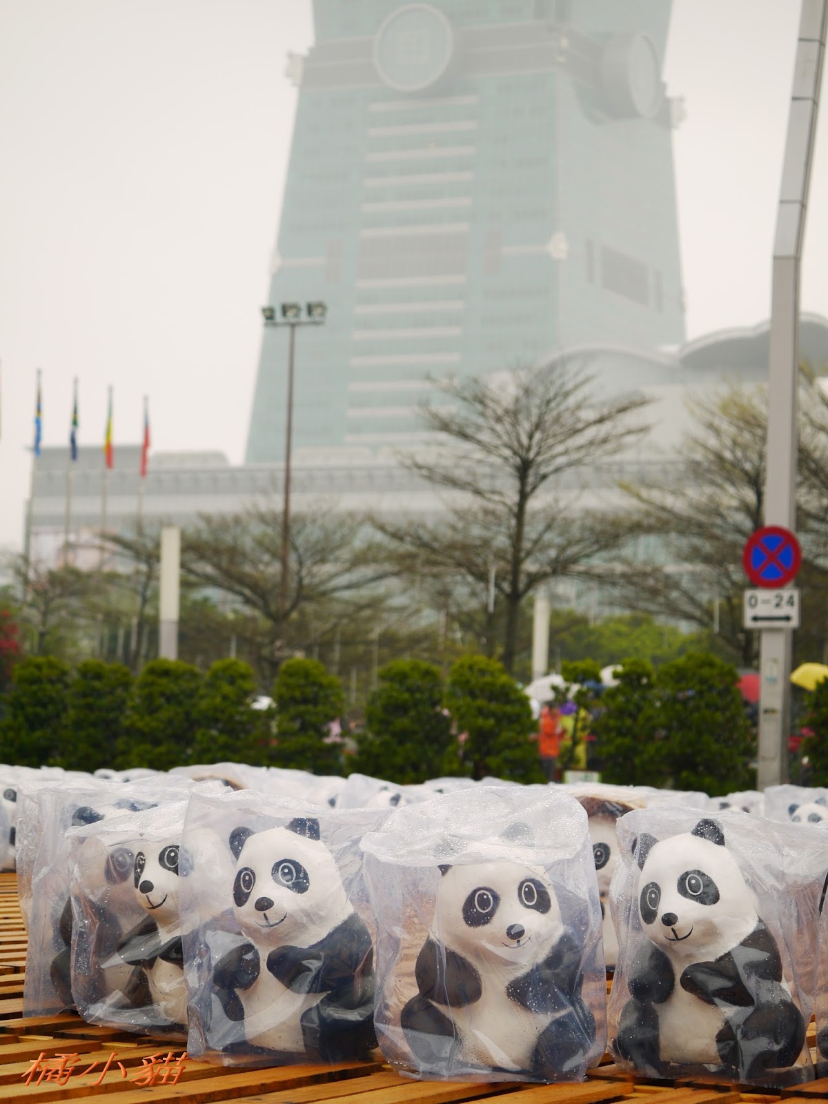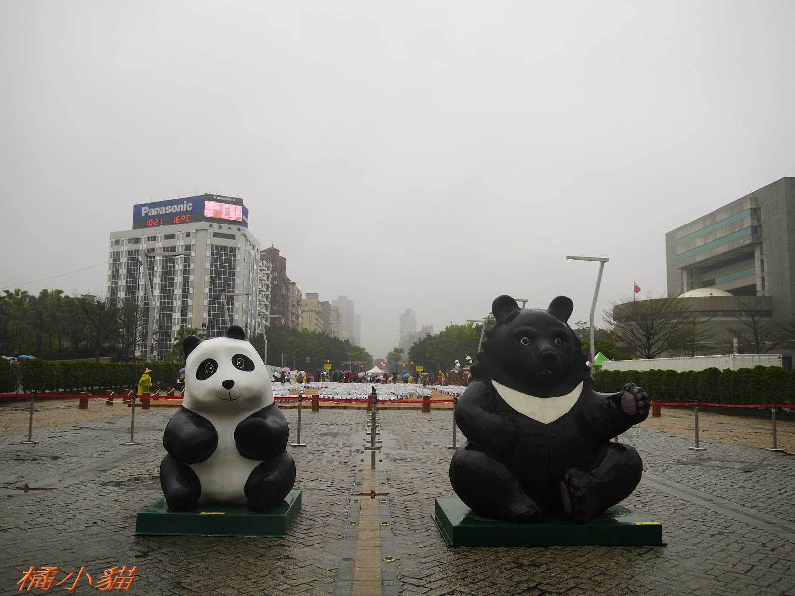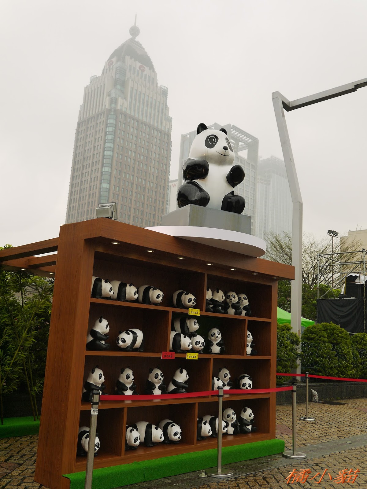 1600隻紙熊貓戴著雨衣展出真是創舉 小葉欖仁樹沒葉子照得很有意境很美!推~~~