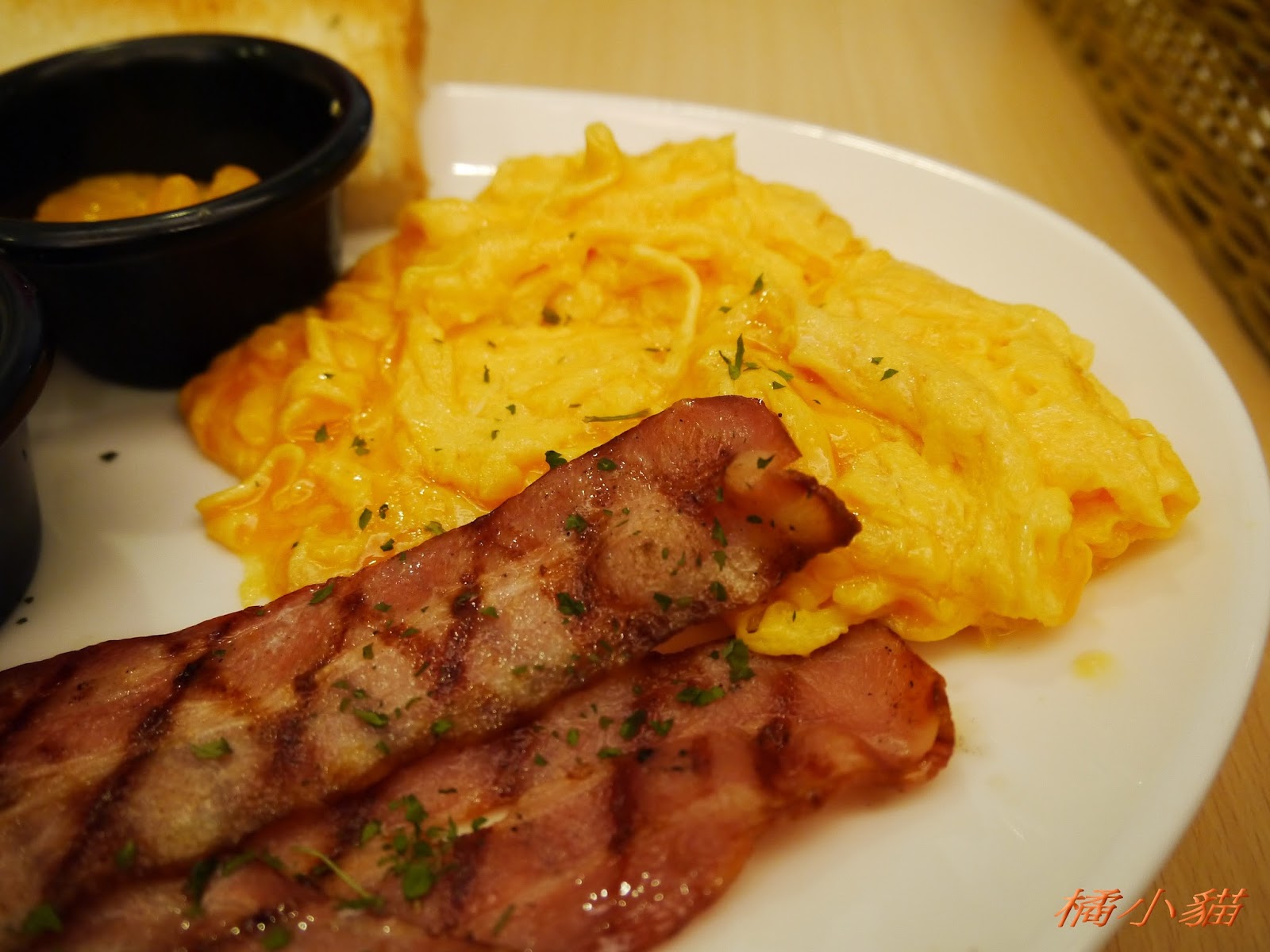 那隻熊真的好可愛喔~~ 還有那份培根炒蛋看起來也不錯吃