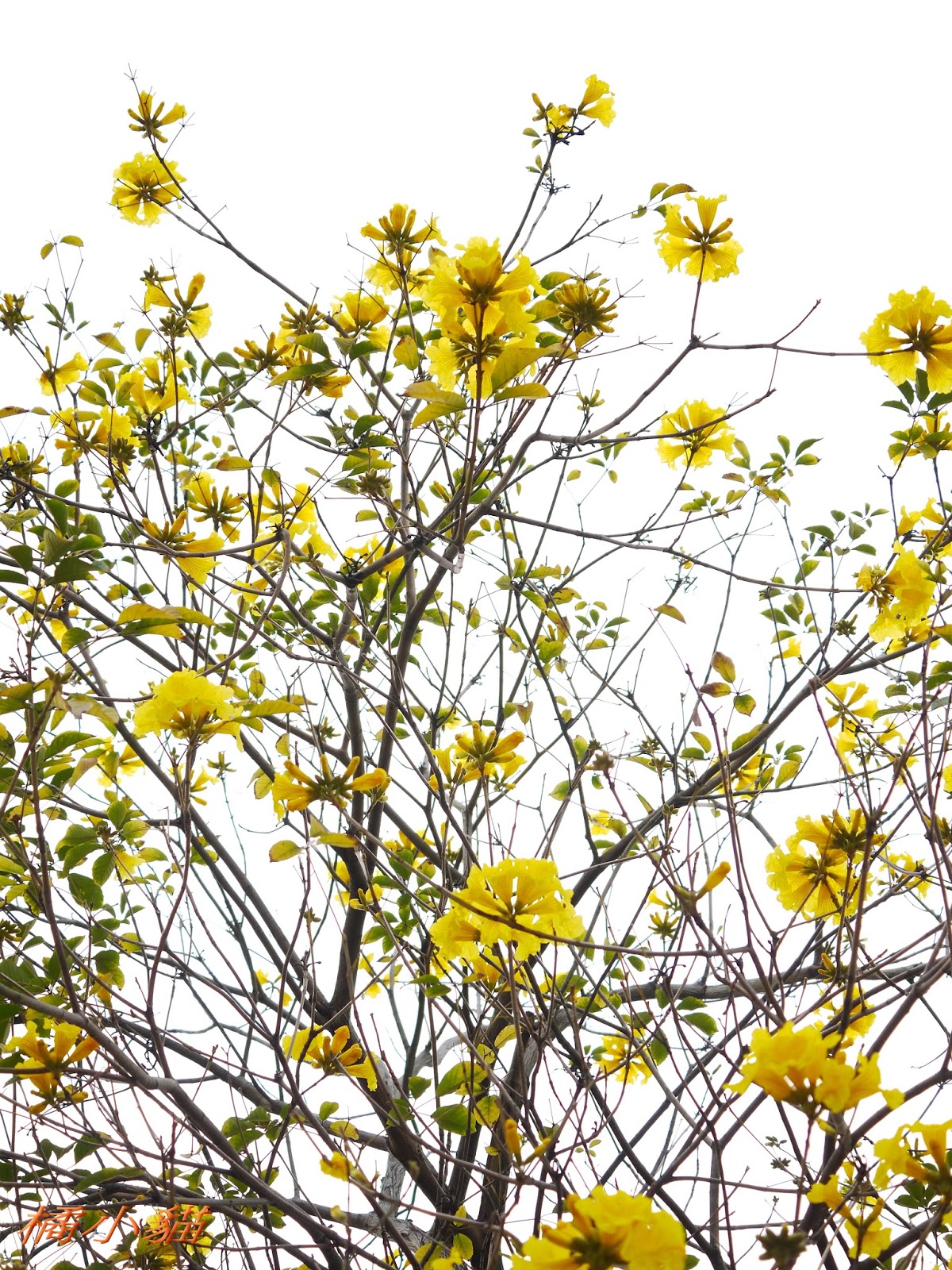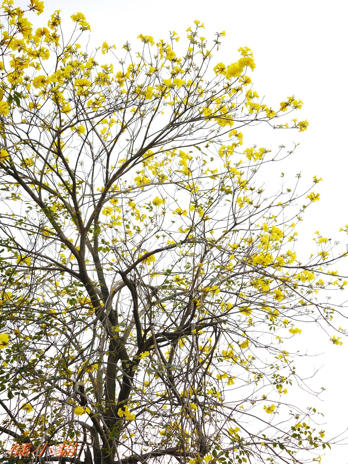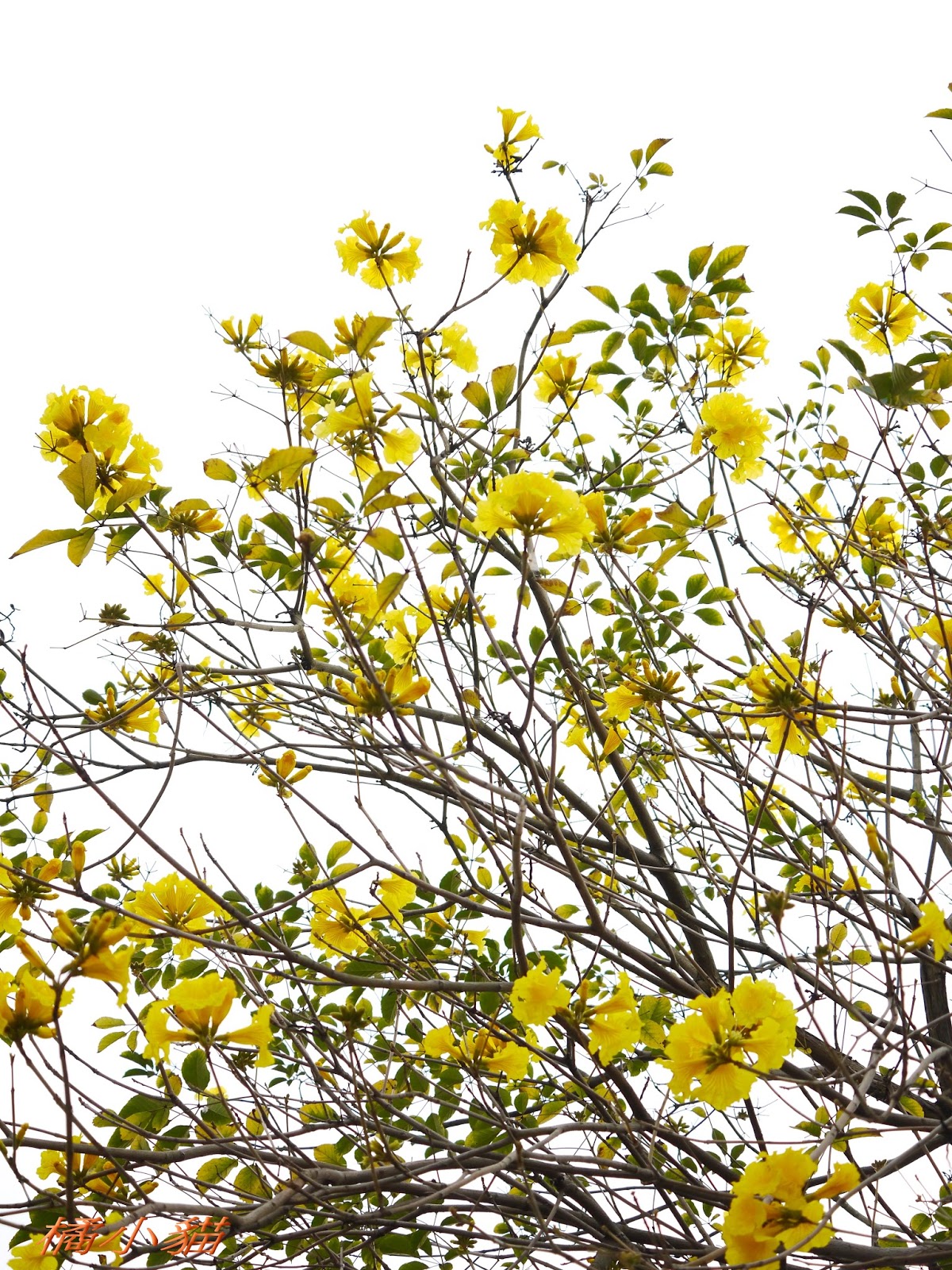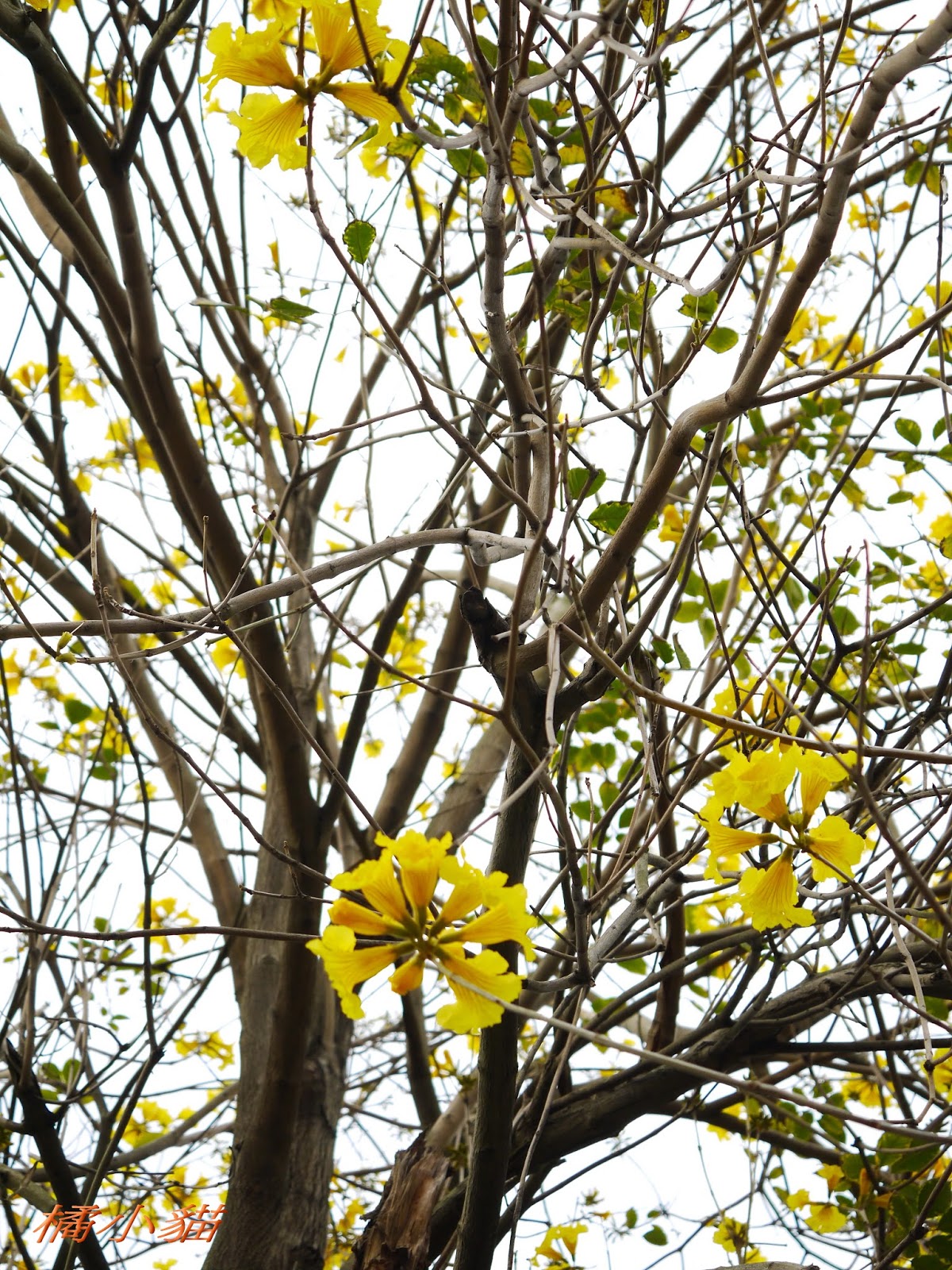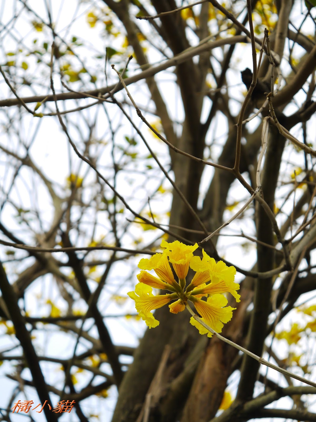 我前幾天路過淡水某條路,也看到一棵無葉只有花的黃花風鈴木,不很大棵~~