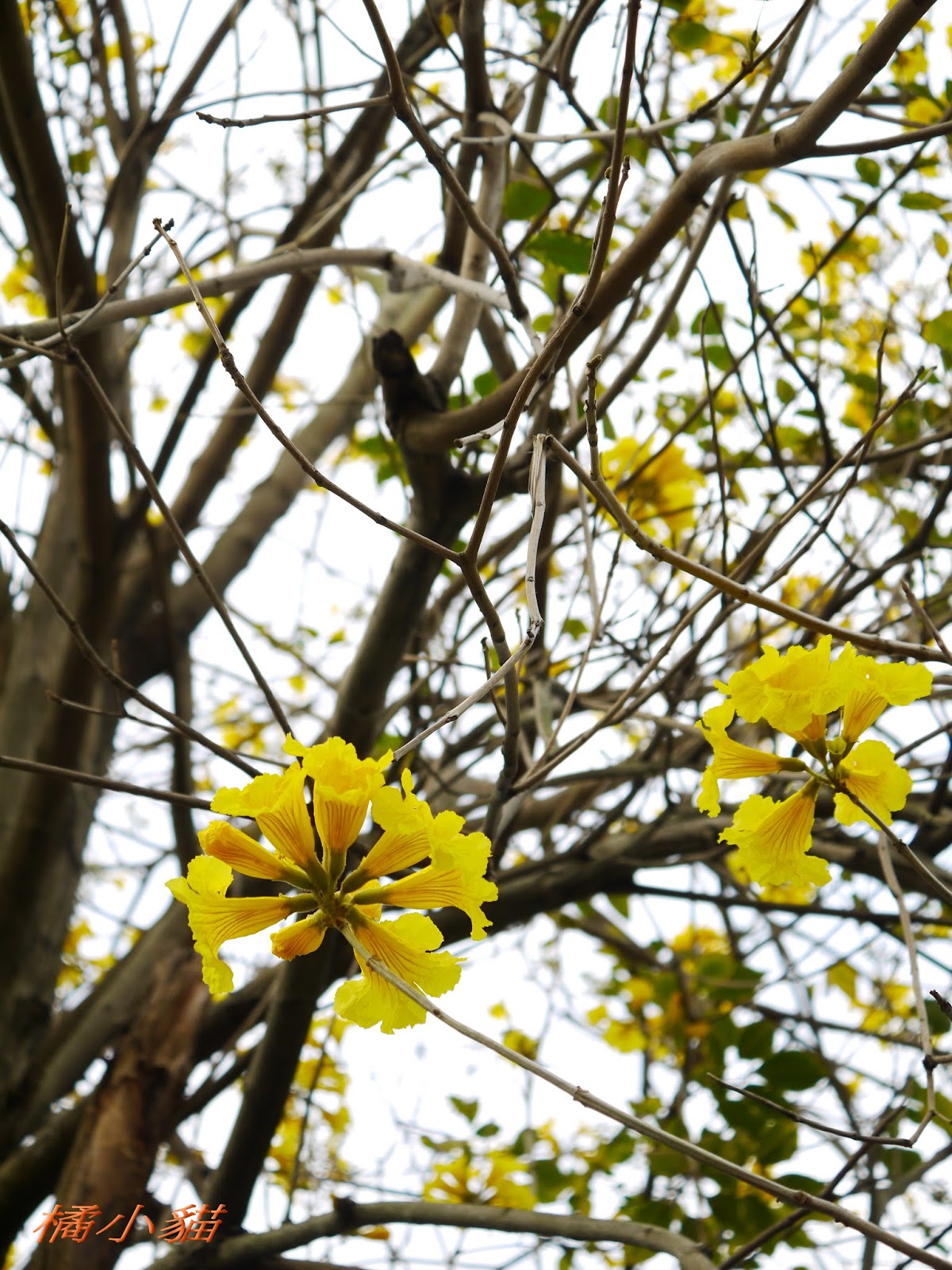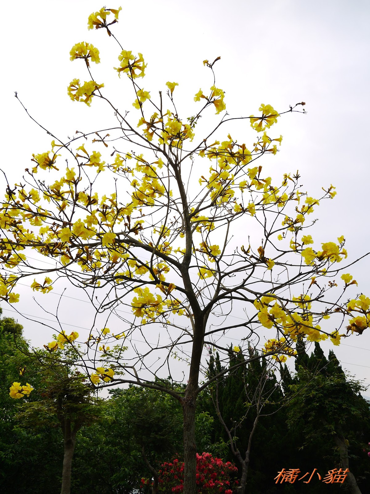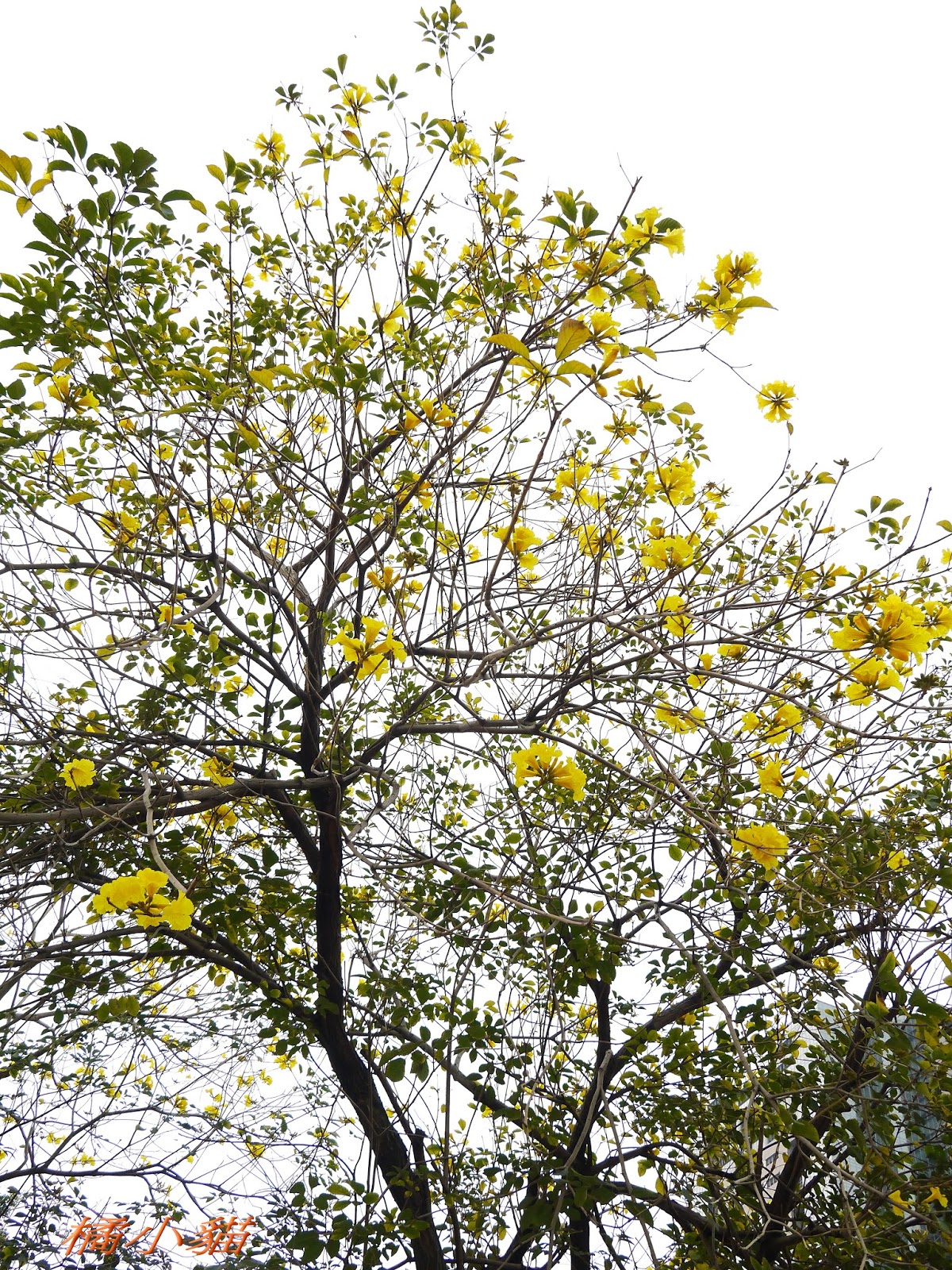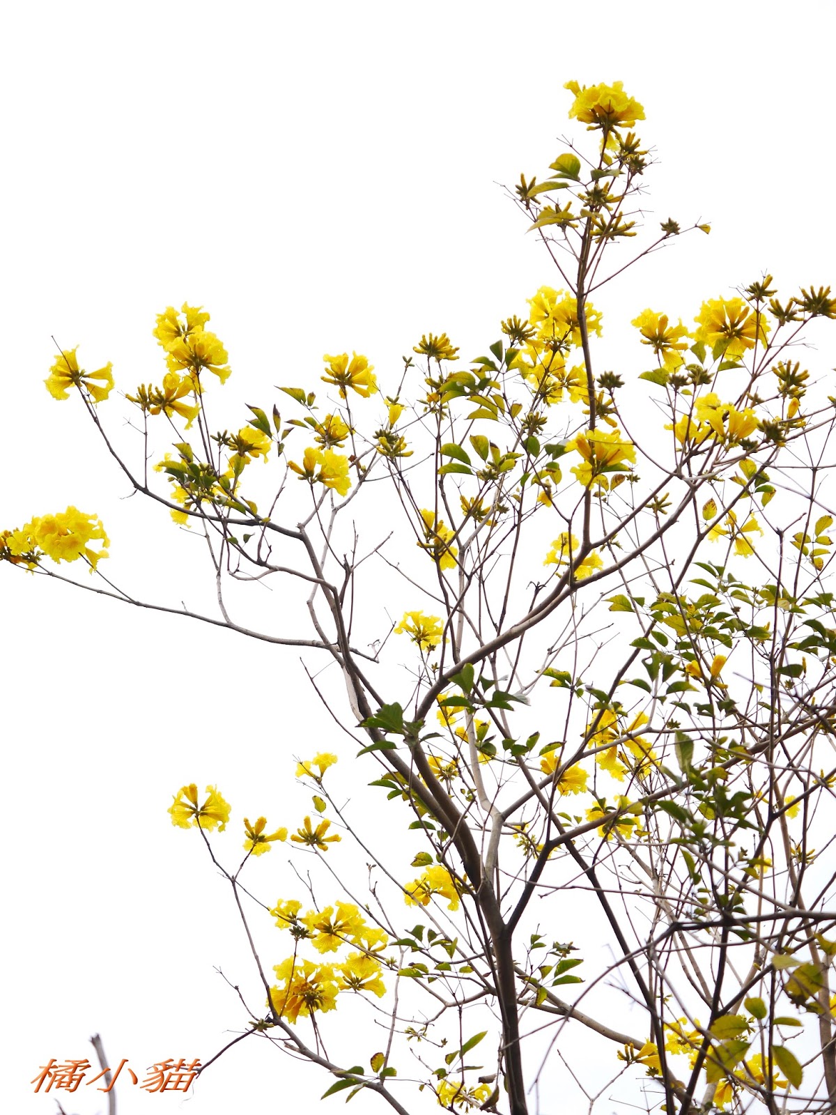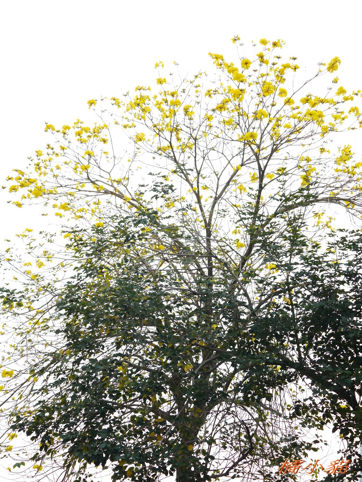 我前幾天路過淡水某條路,也看到一棵無葉只有花的黃花風鈴木,不很大棵~~