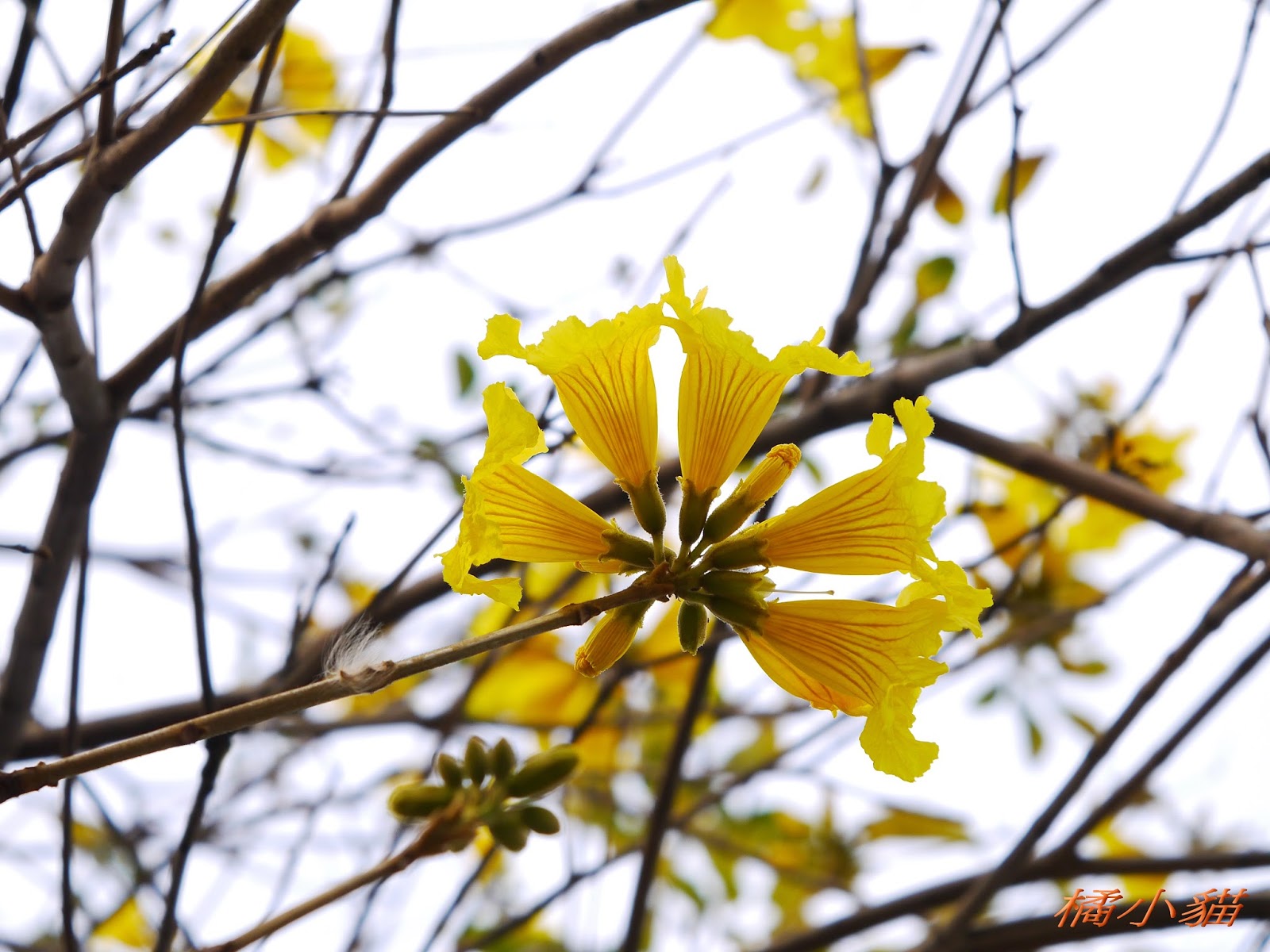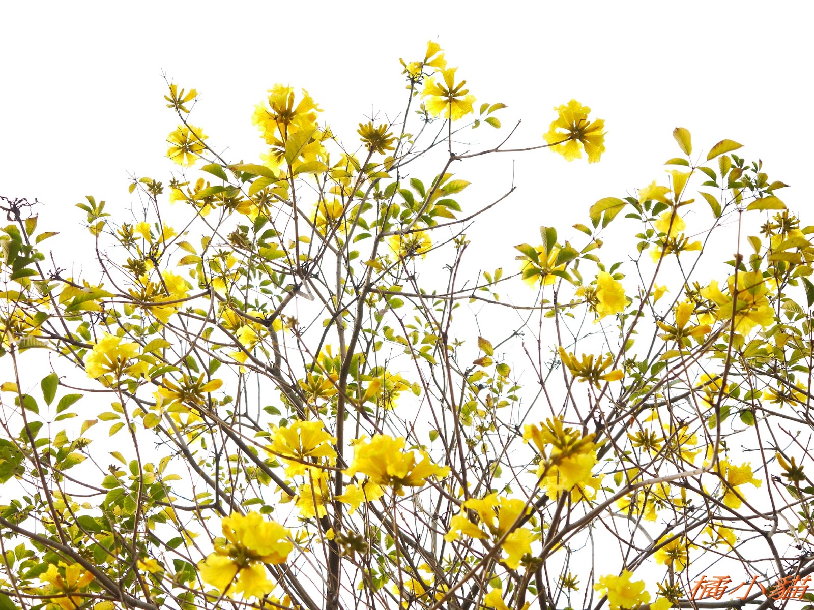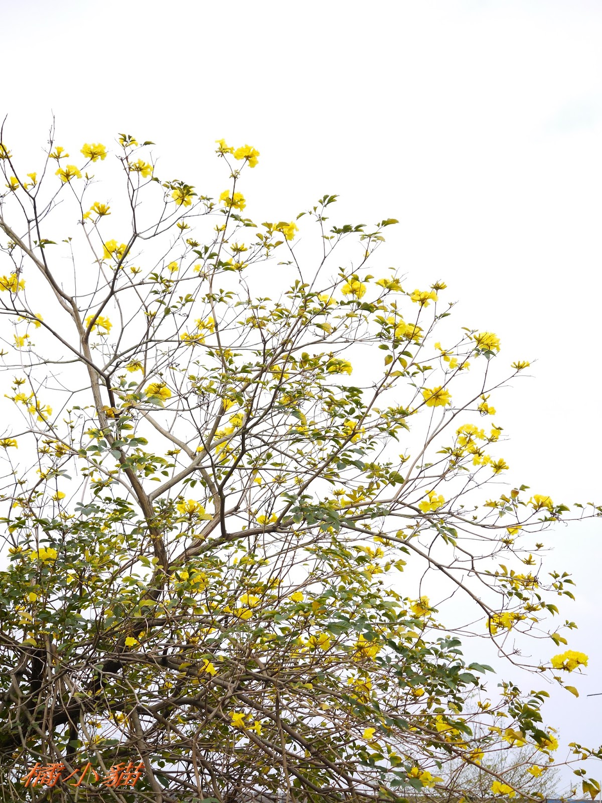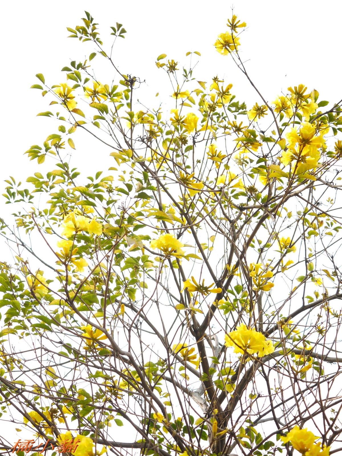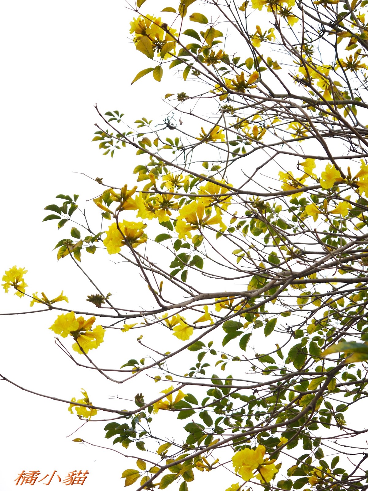 我前幾天路過淡水某條路,也看到一棵無葉只有花的黃花風鈴木,不很大棵~~