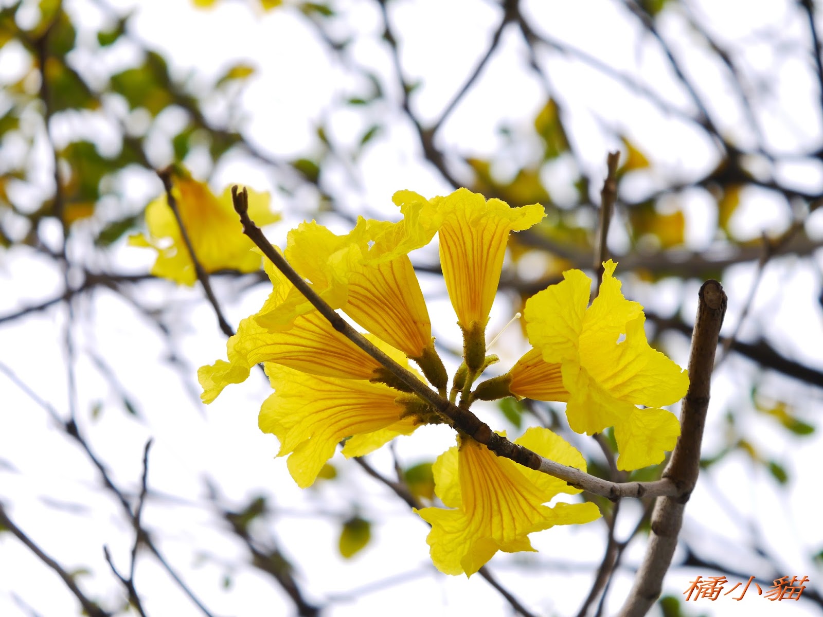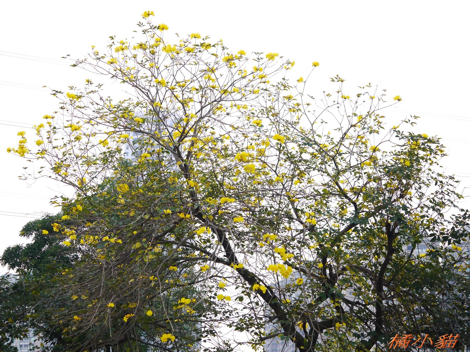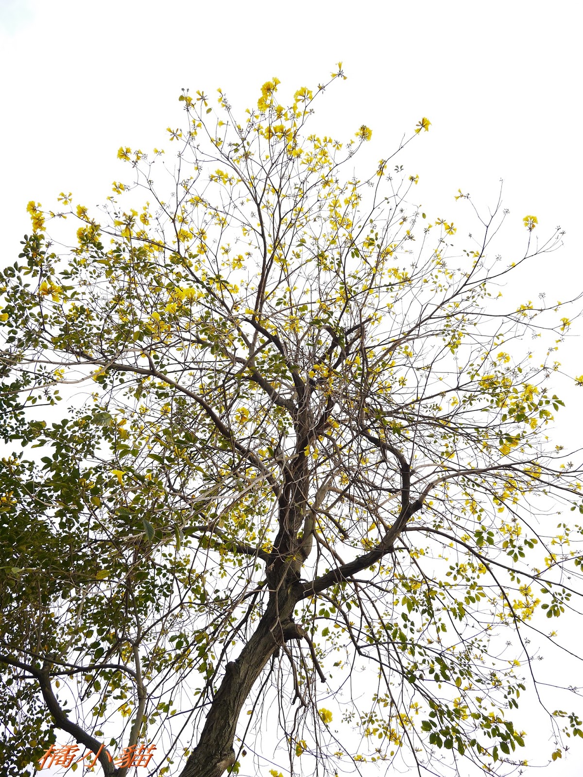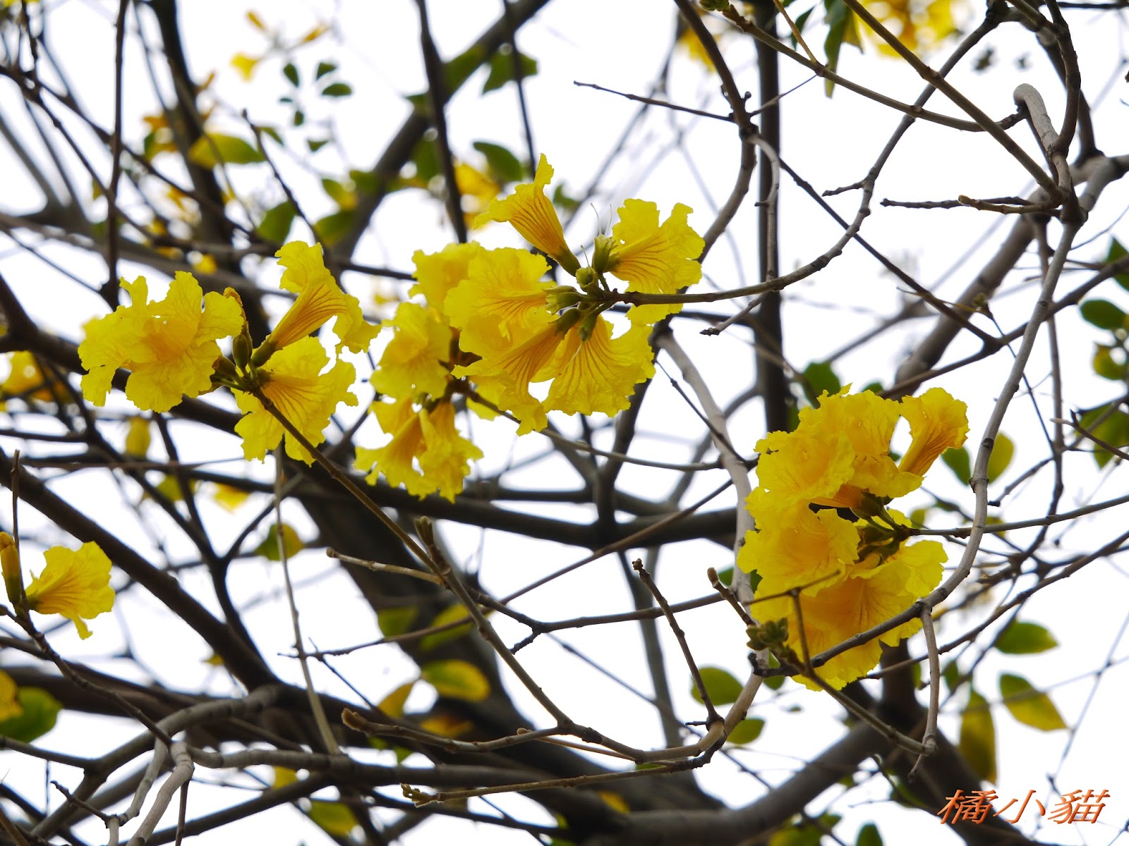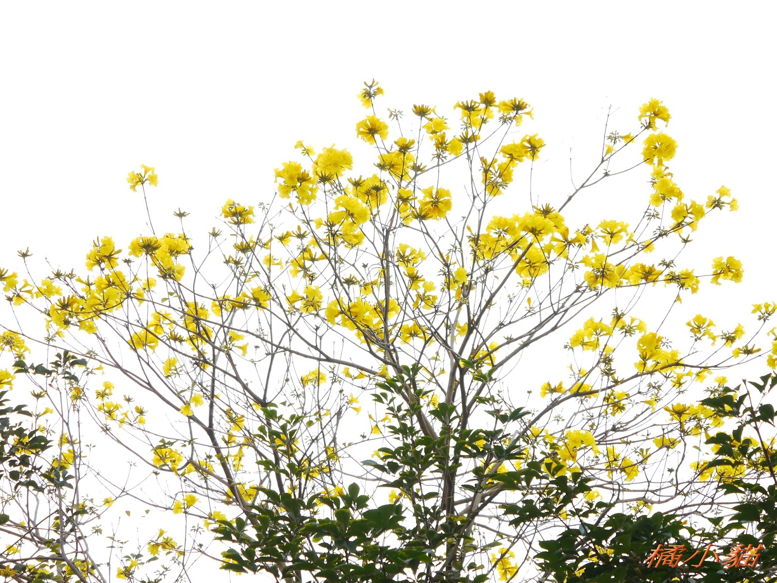 我前幾天路過淡水某條路,也看到一棵無葉只有花的黃花風鈴木,不很大棵~~