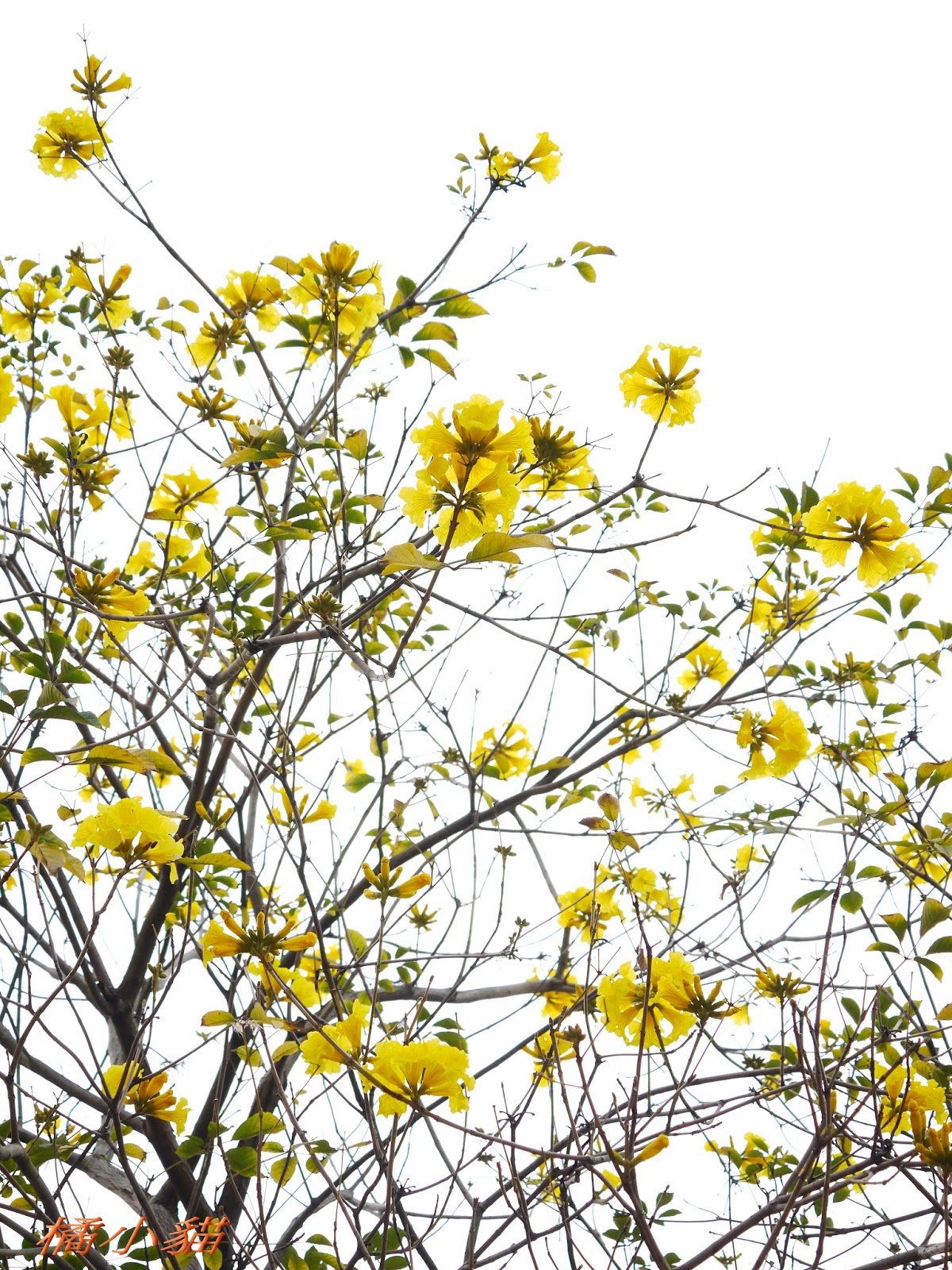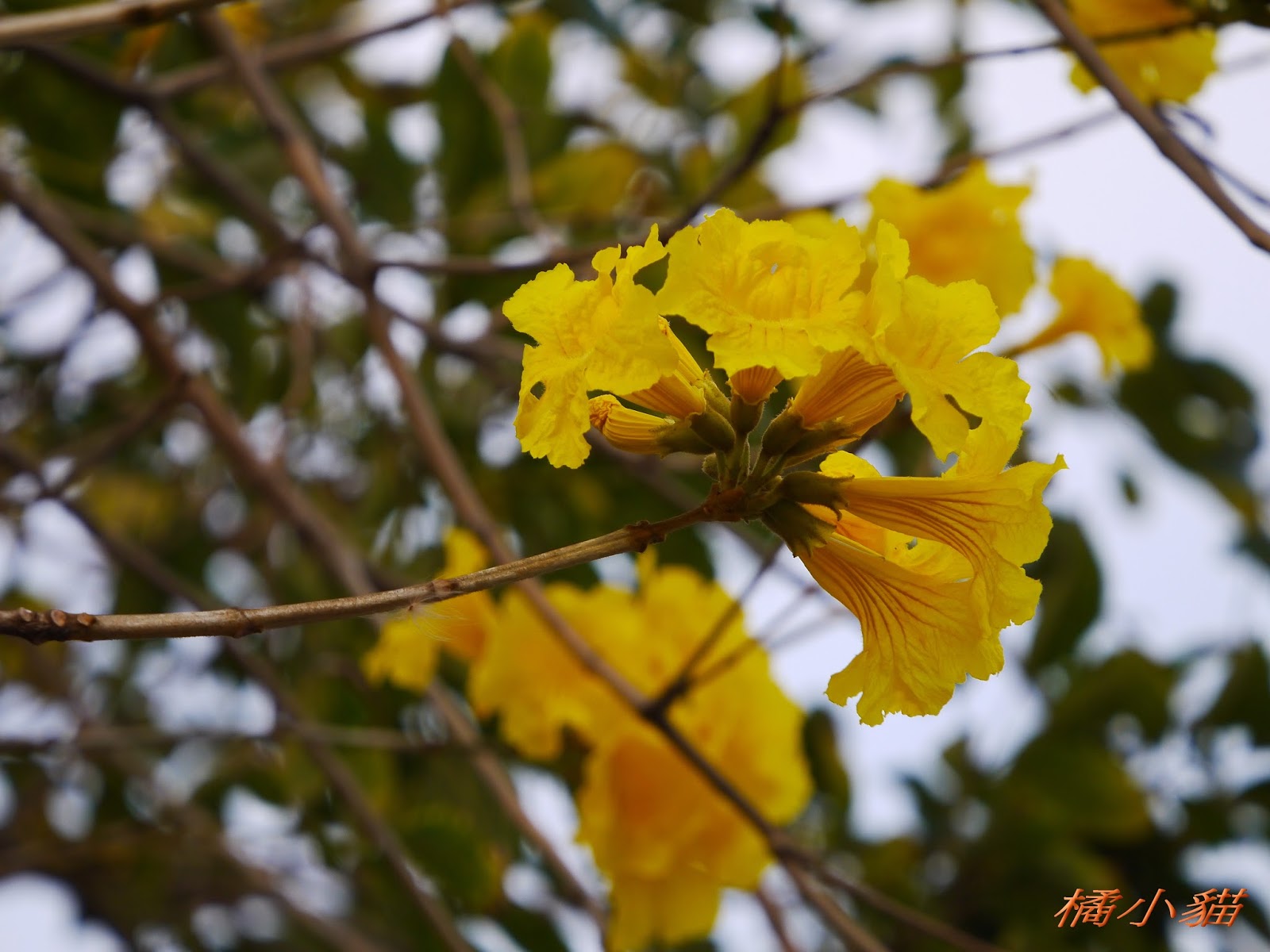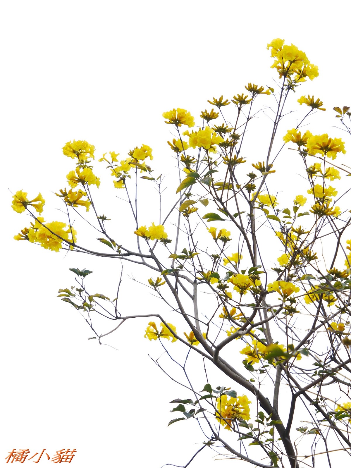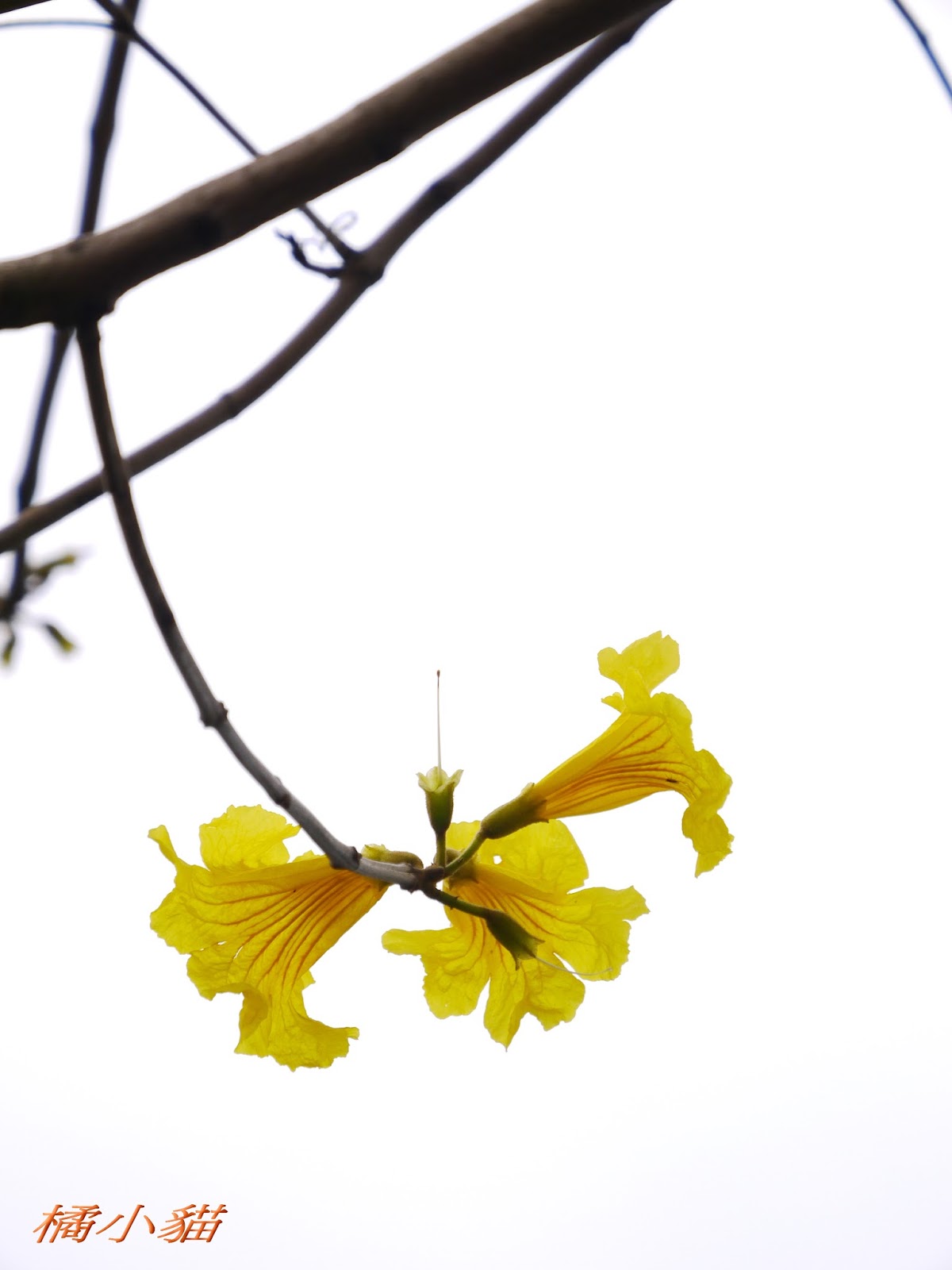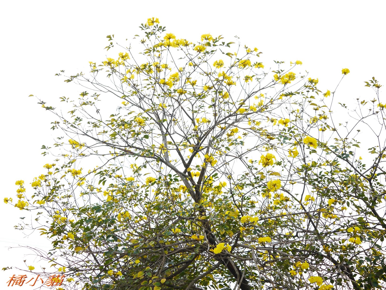 我前幾天路過淡水某條路,也看到一棵無葉只有花的黃花風鈴木,不很大棵~~