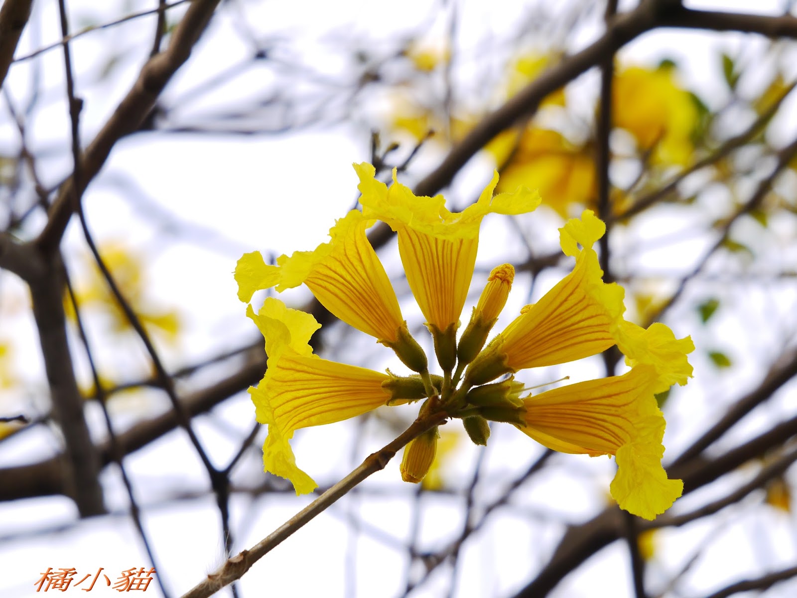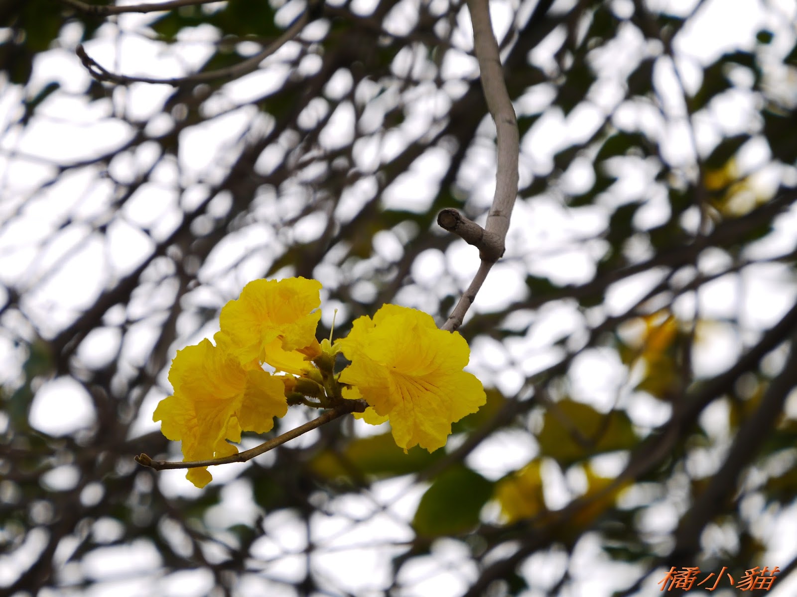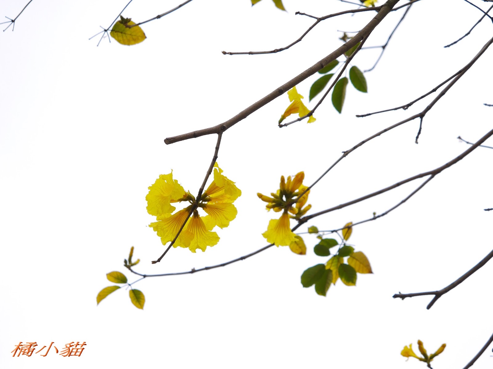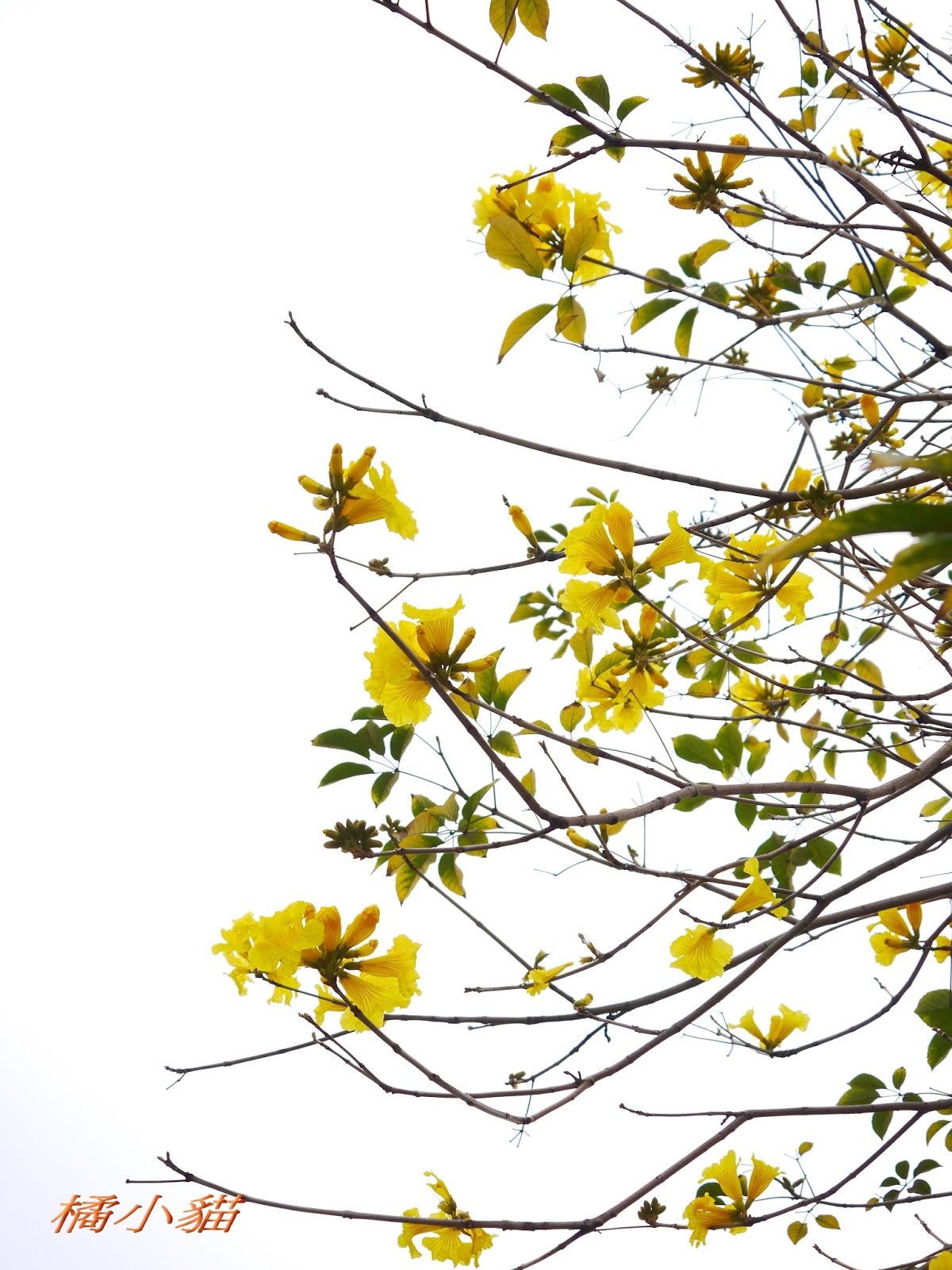 我前幾天路過淡水某條路,也看到一棵無葉只有花的黃花風鈴木,不很大棵~~