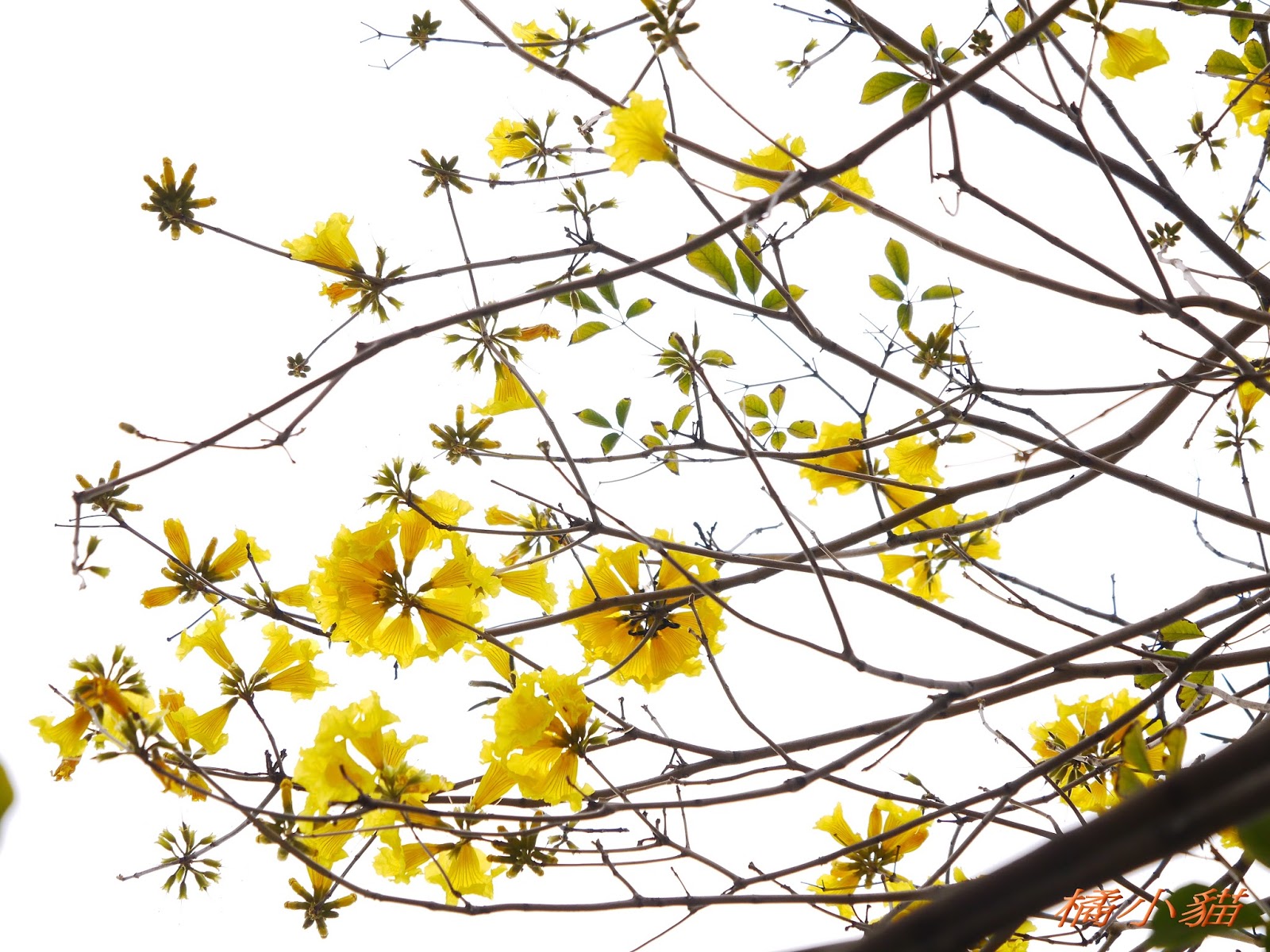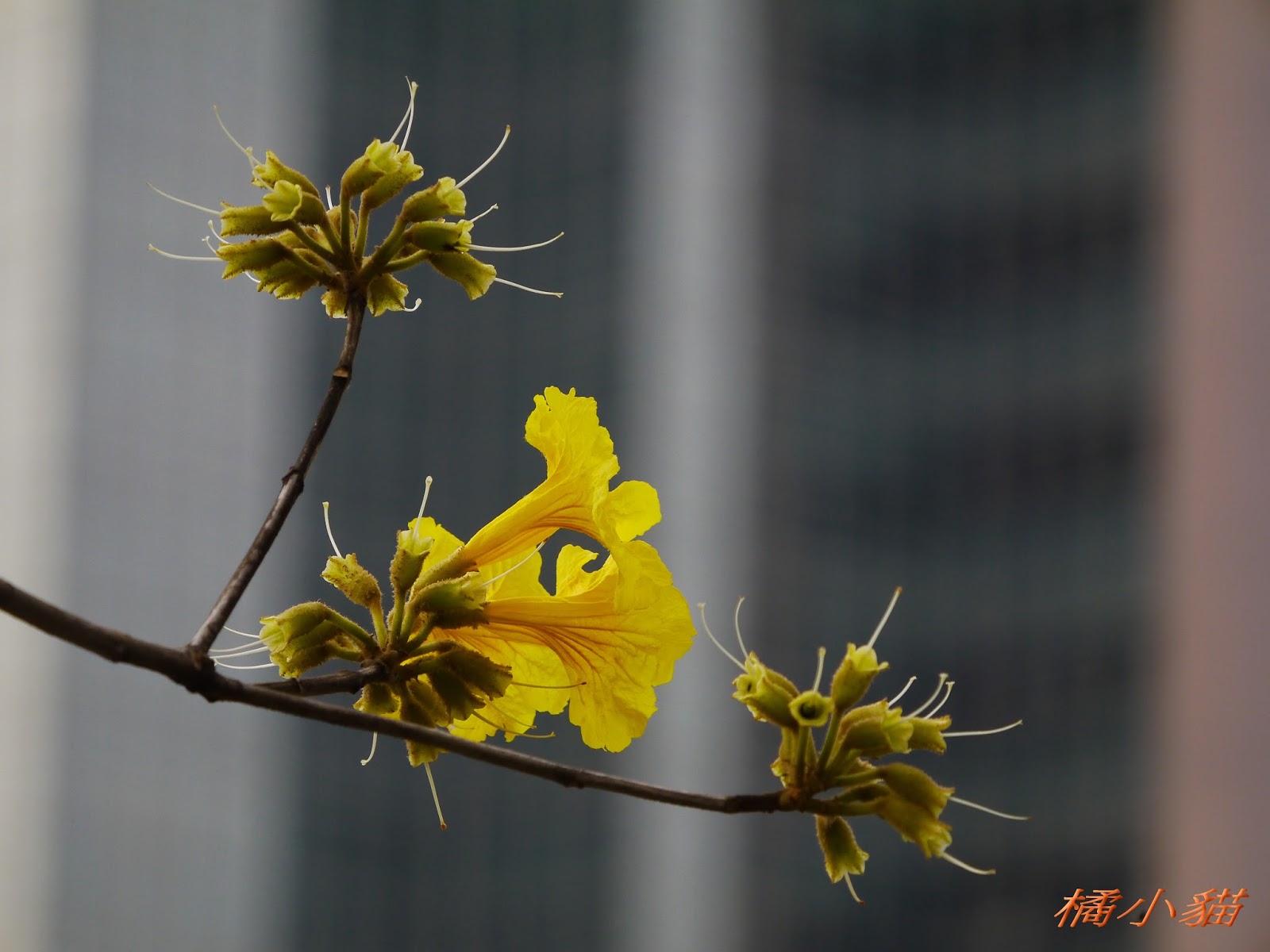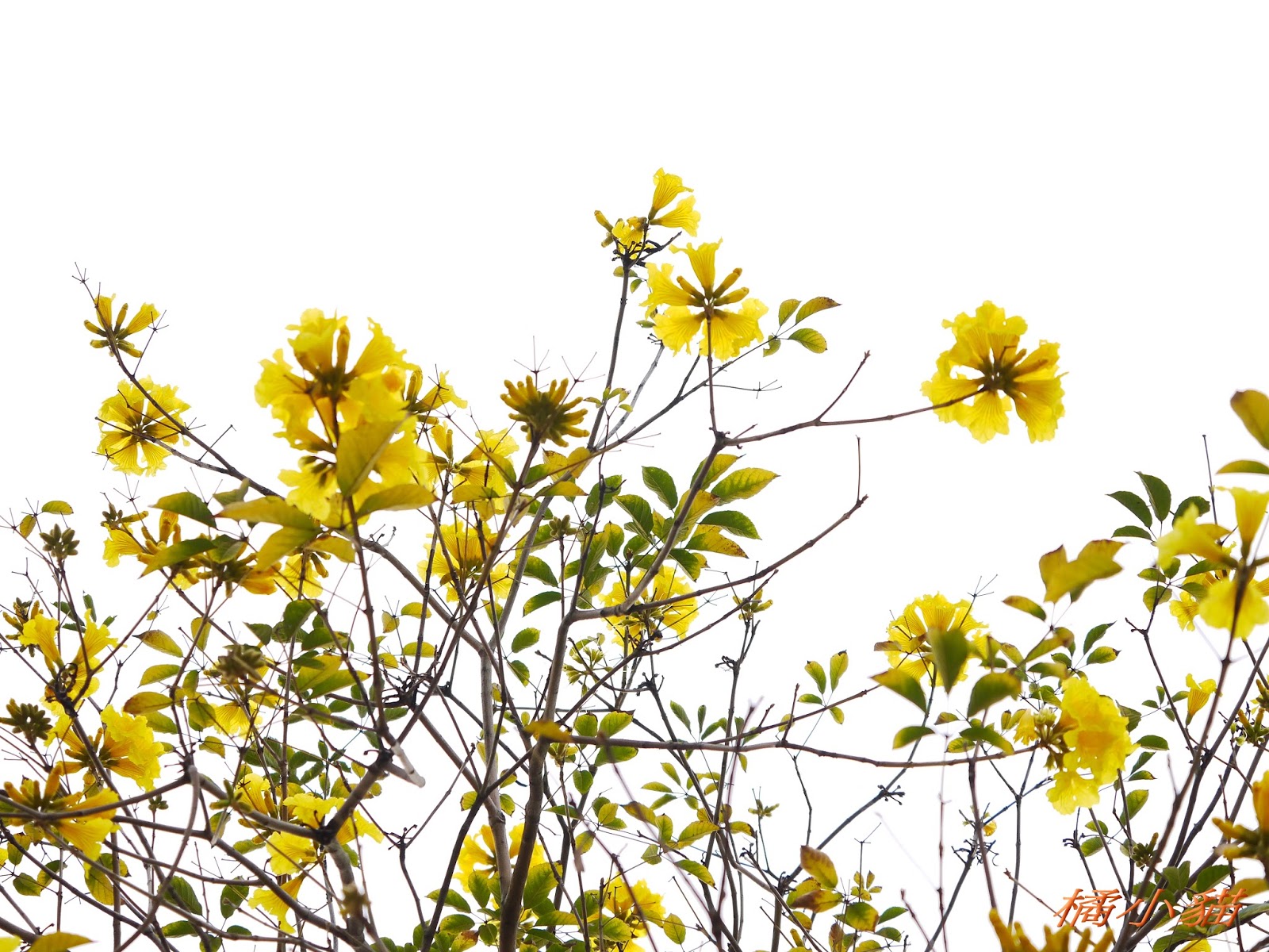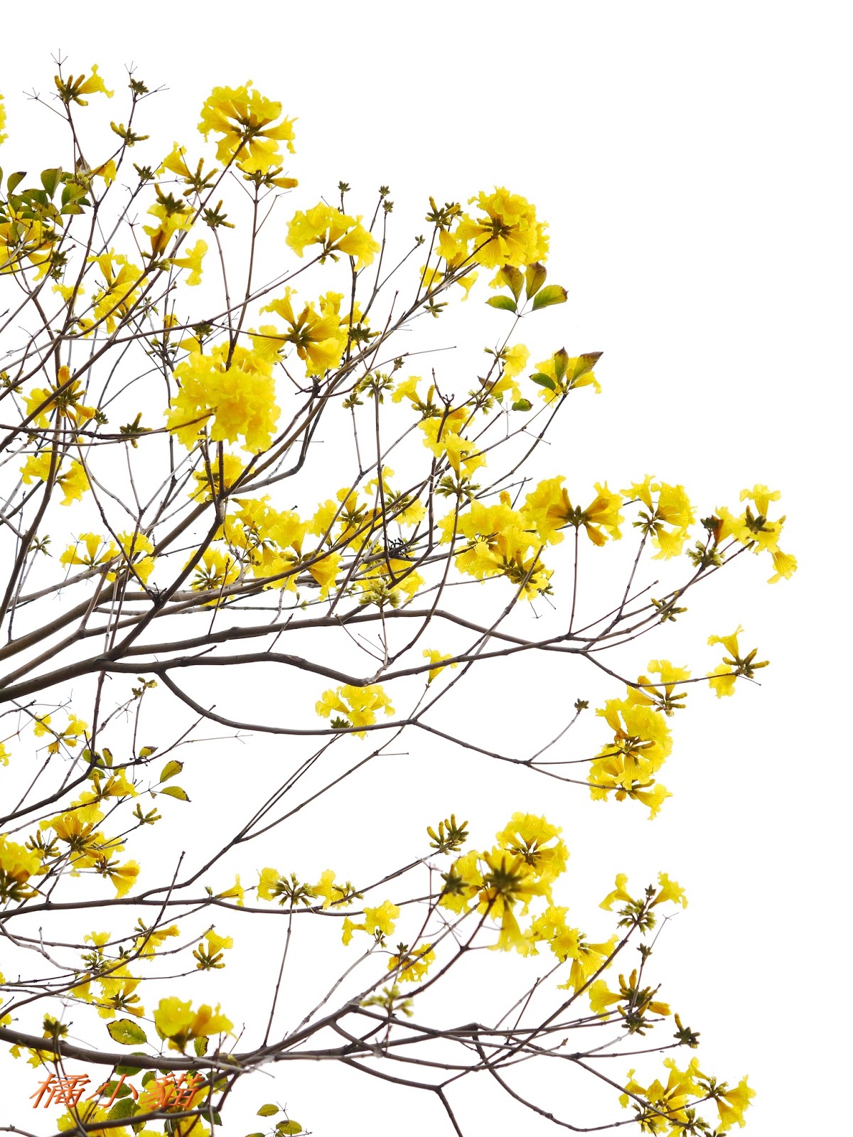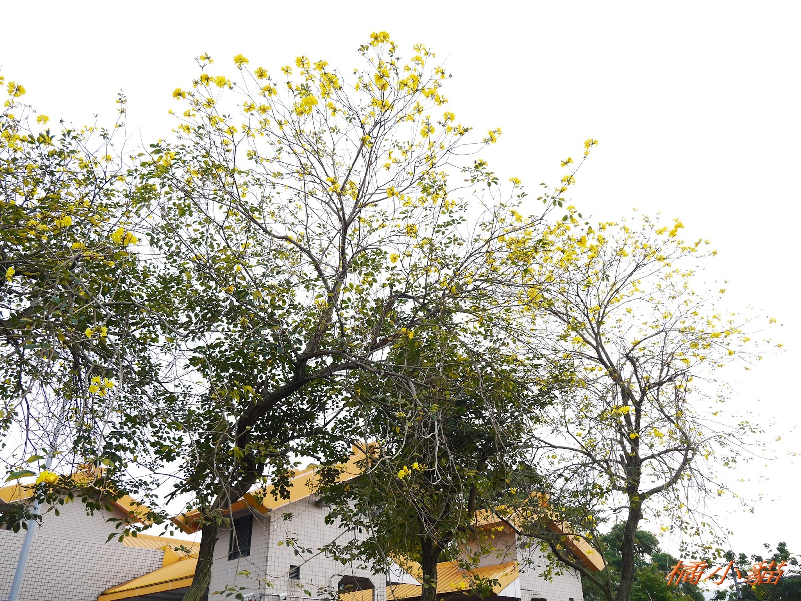 我前幾天路過淡水某條路,也看到一棵無葉只有花的黃花風鈴木,不很大棵~~