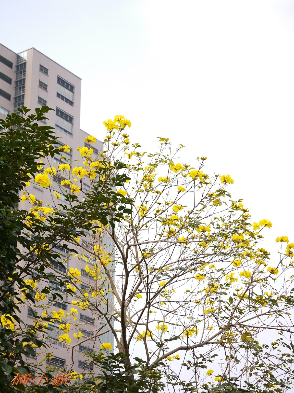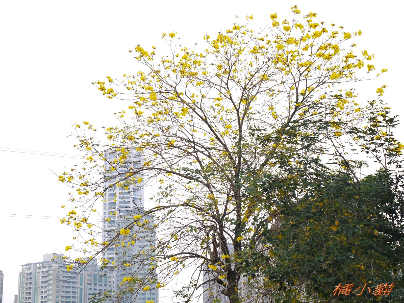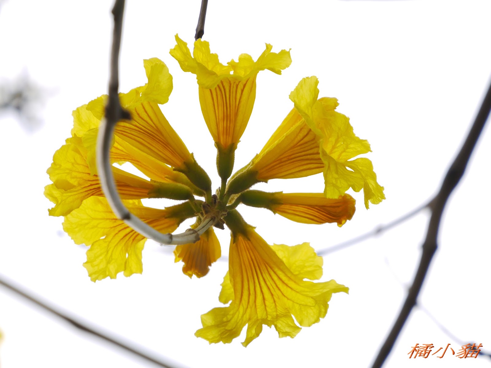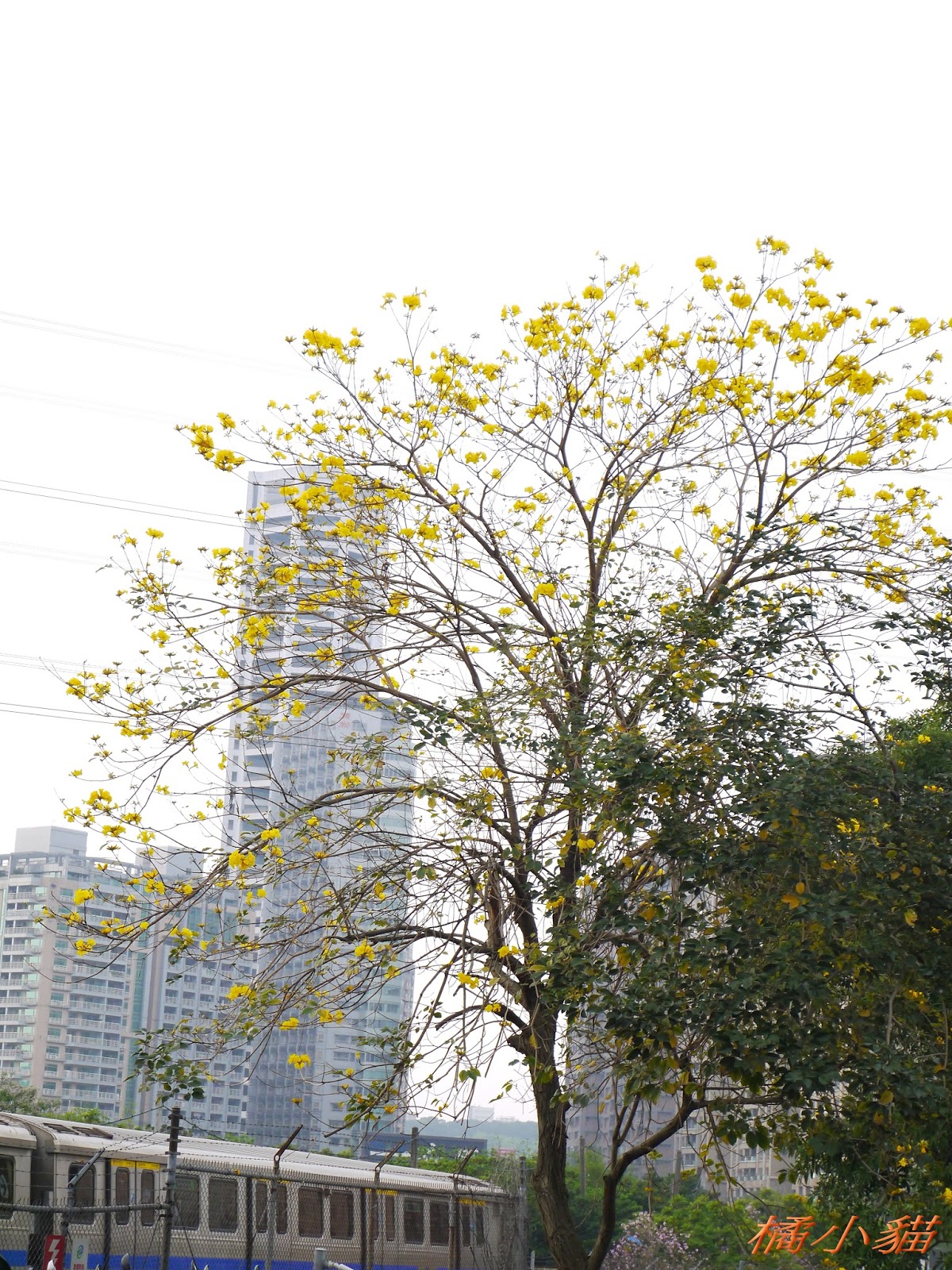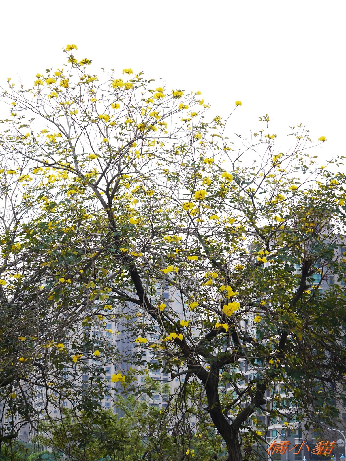 我前幾天路過淡水某條路,也看到一棵無葉只有花的黃花風鈴木,不很大棵~~