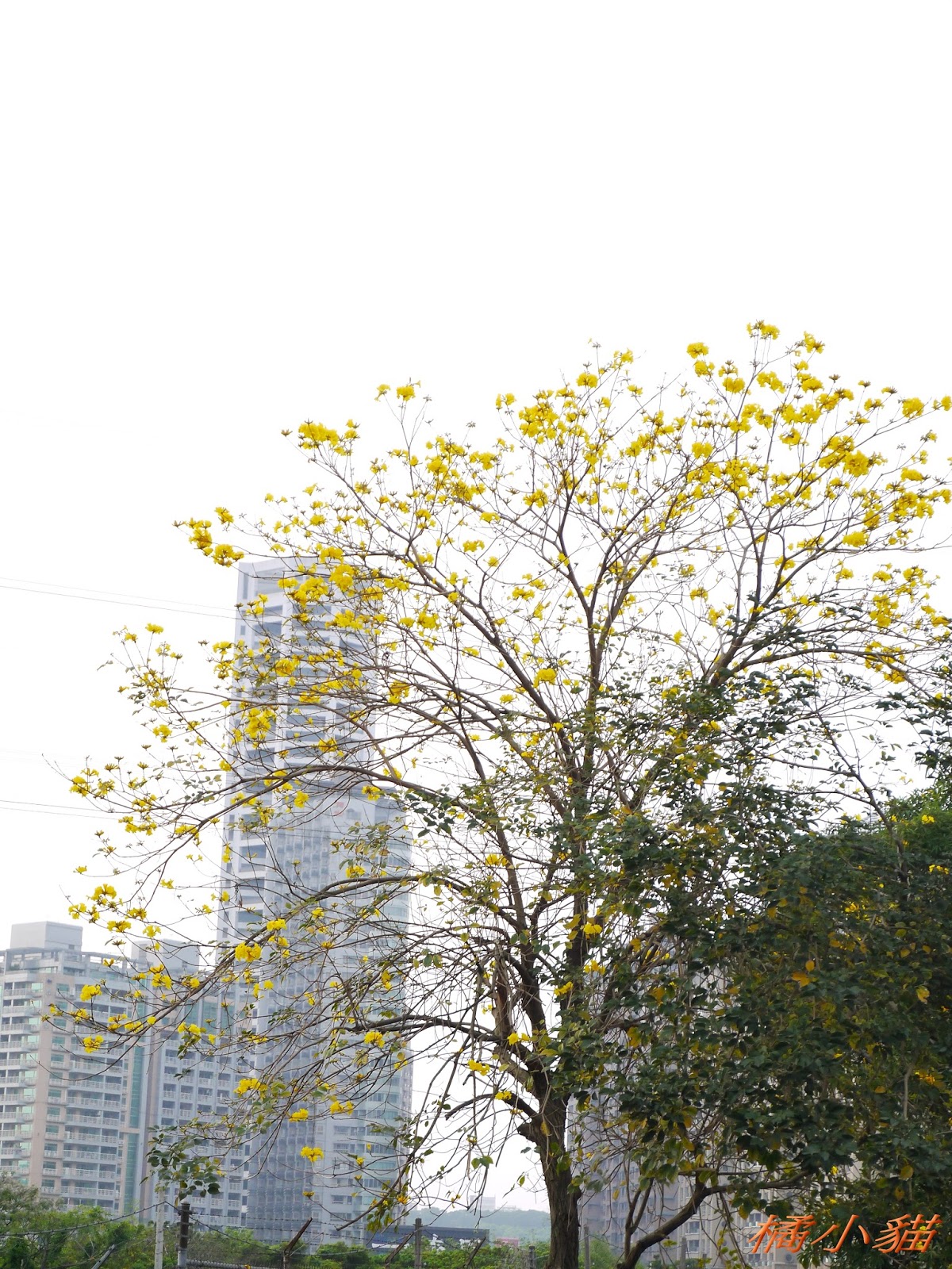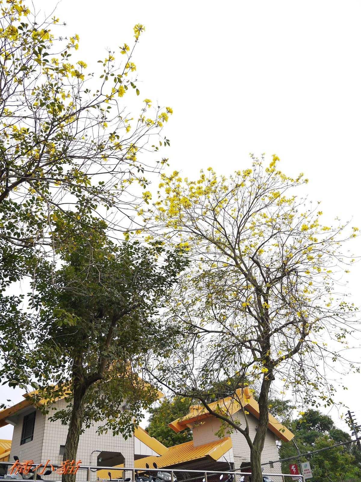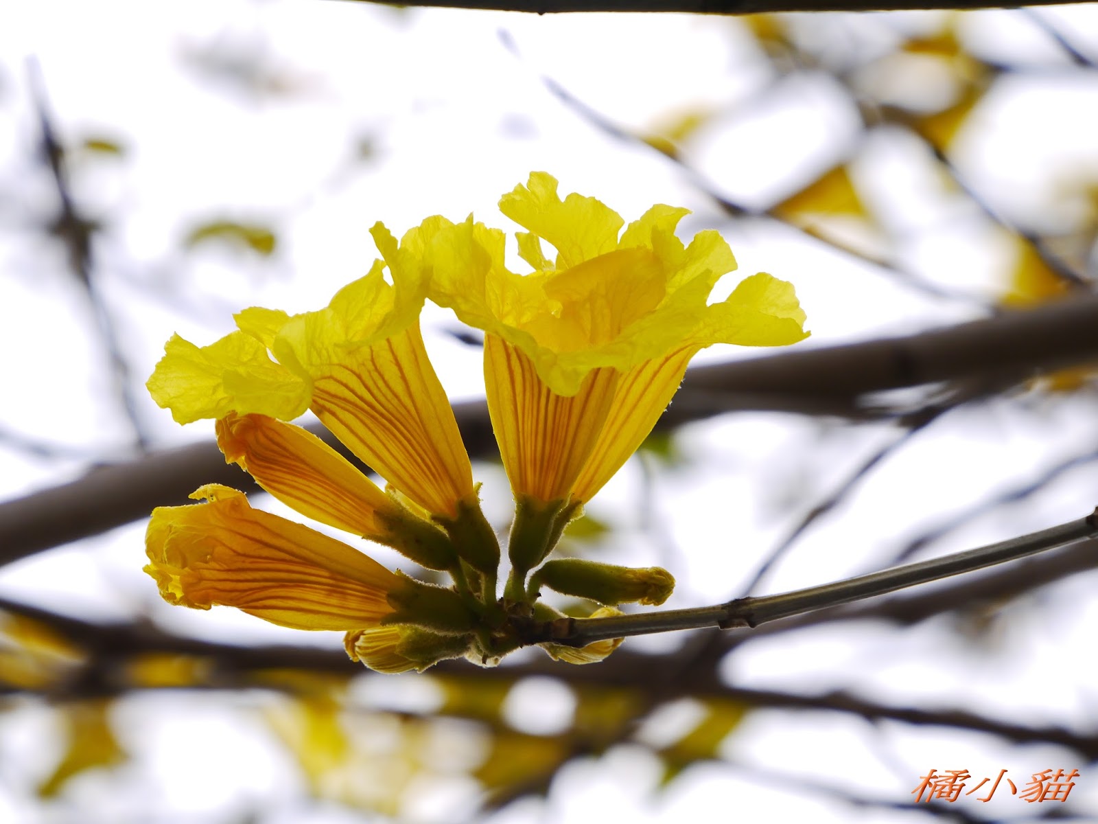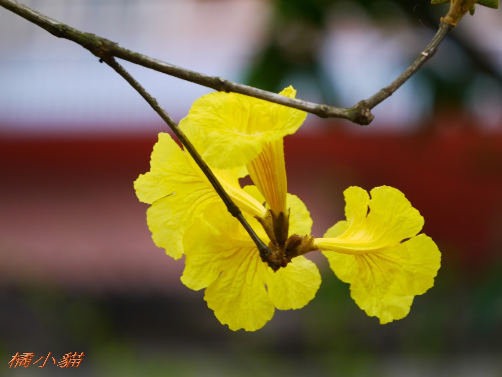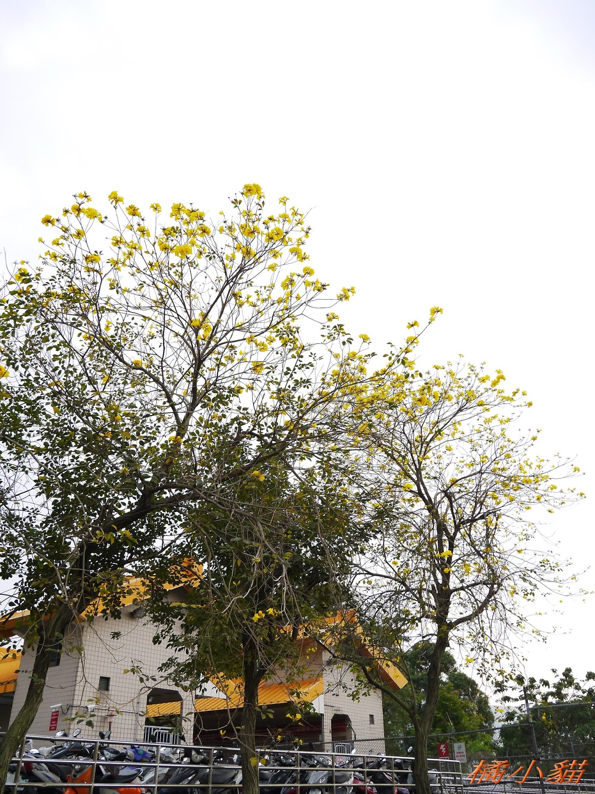 我前幾天路過淡水某條路,也看到一棵無葉只有花的黃花風鈴木,不很大棵~~
