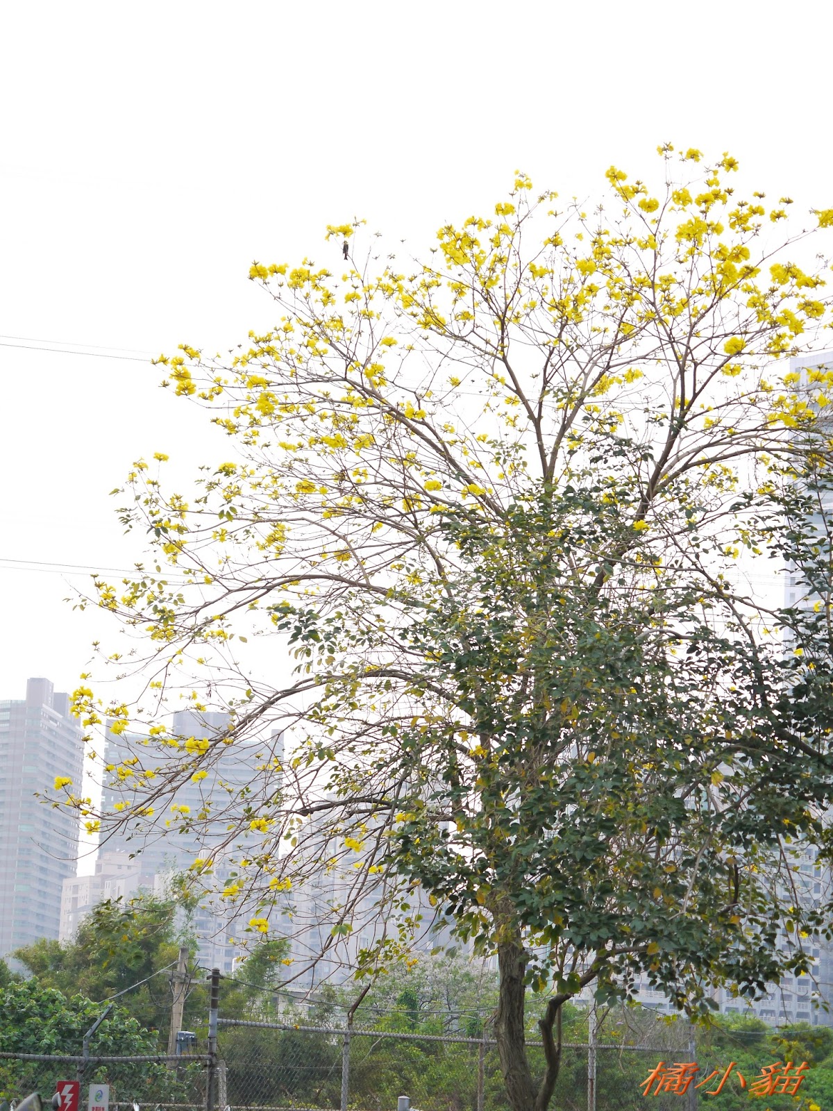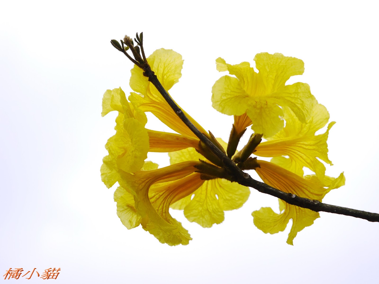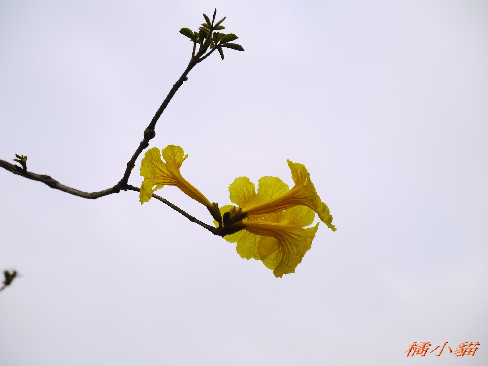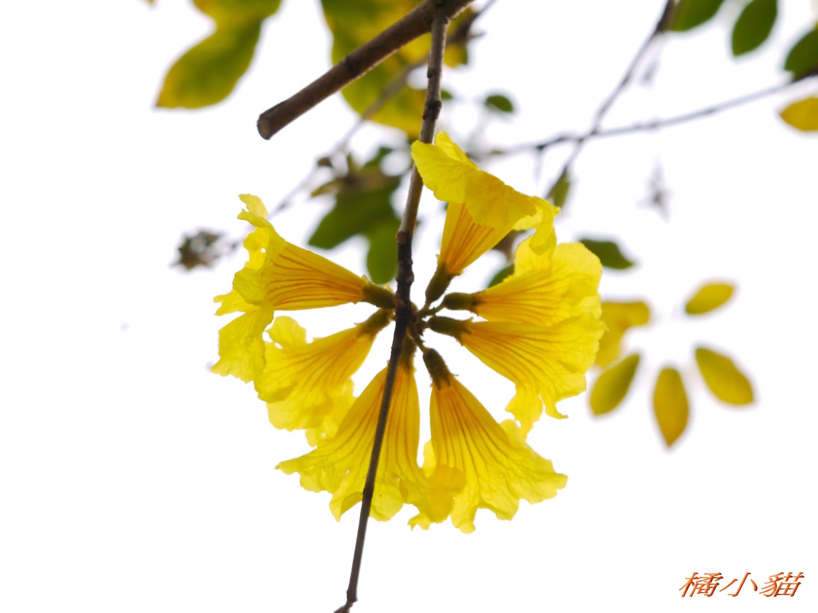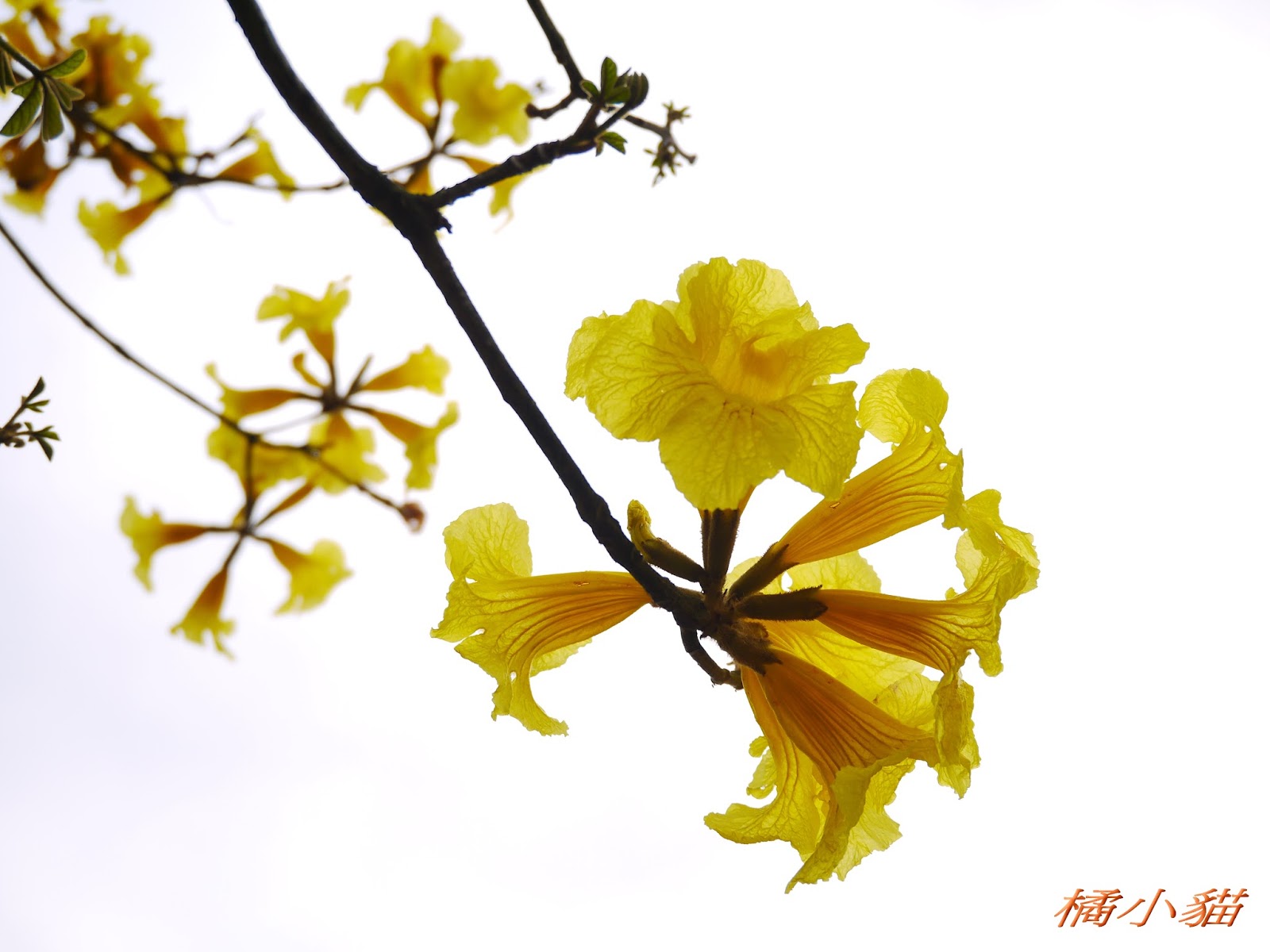 我前幾天路過淡水某條路,也看到一棵無葉只有花的黃花風鈴木,不很大棵~~