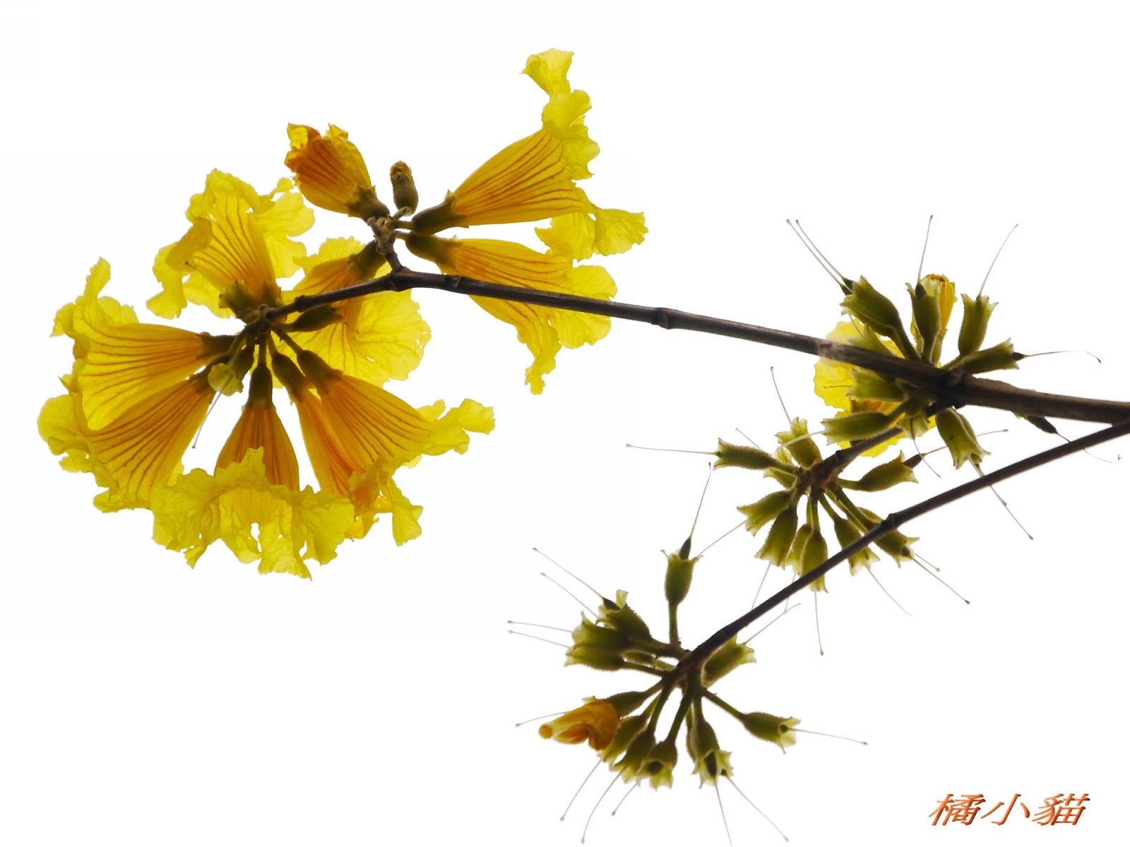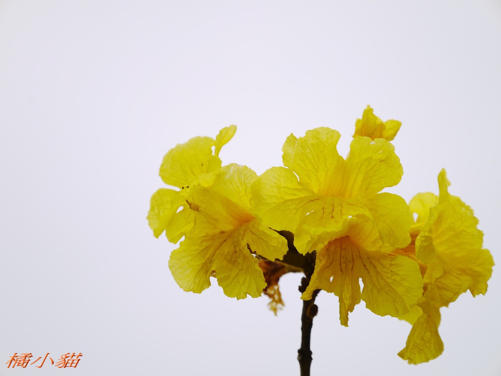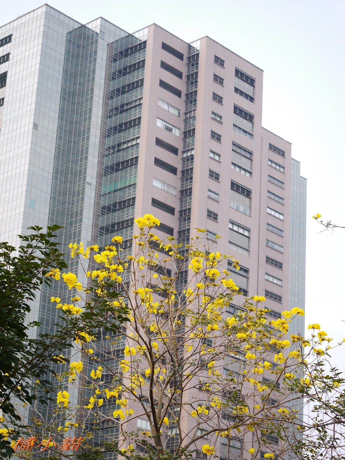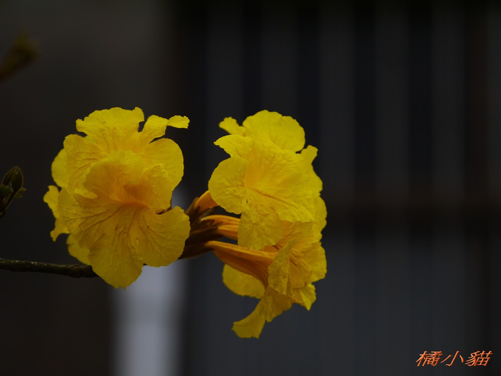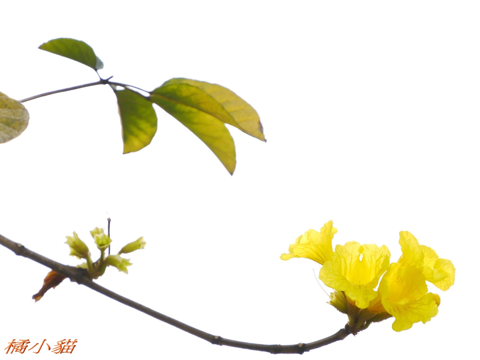 我前幾天路過淡水某條路,也看到一棵無葉只有花的黃花風鈴木,不很大棵~~