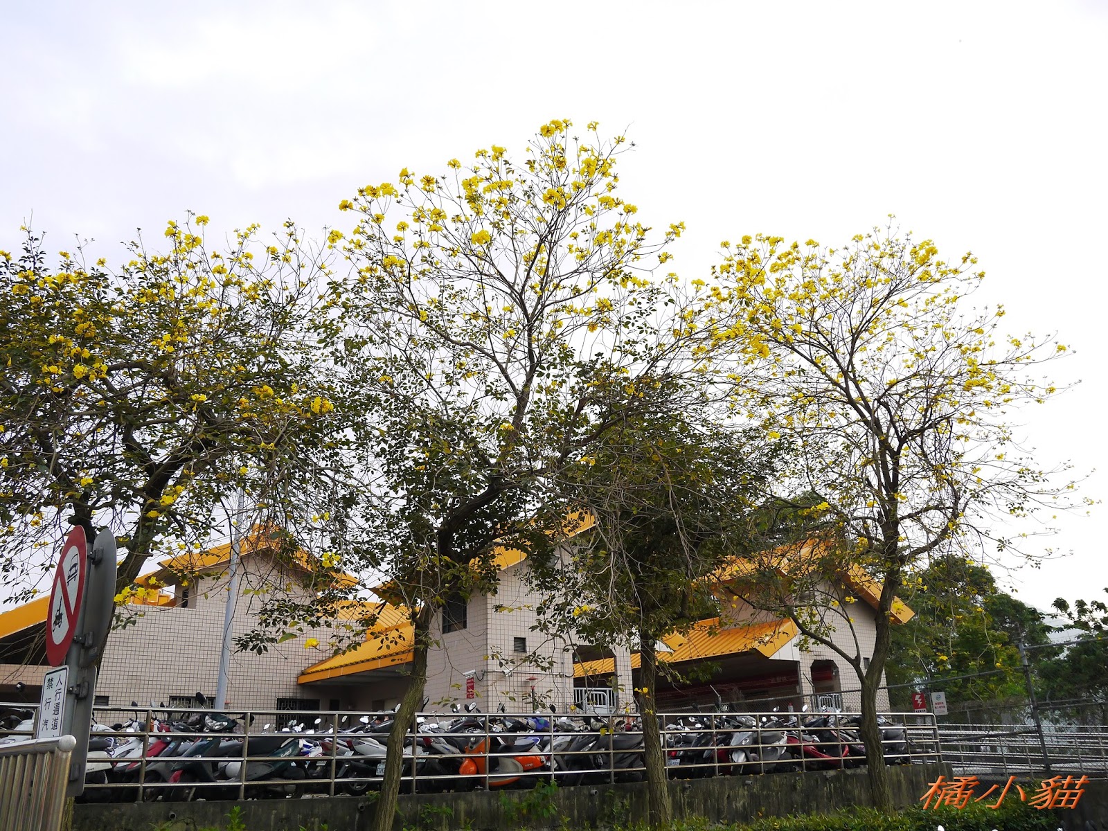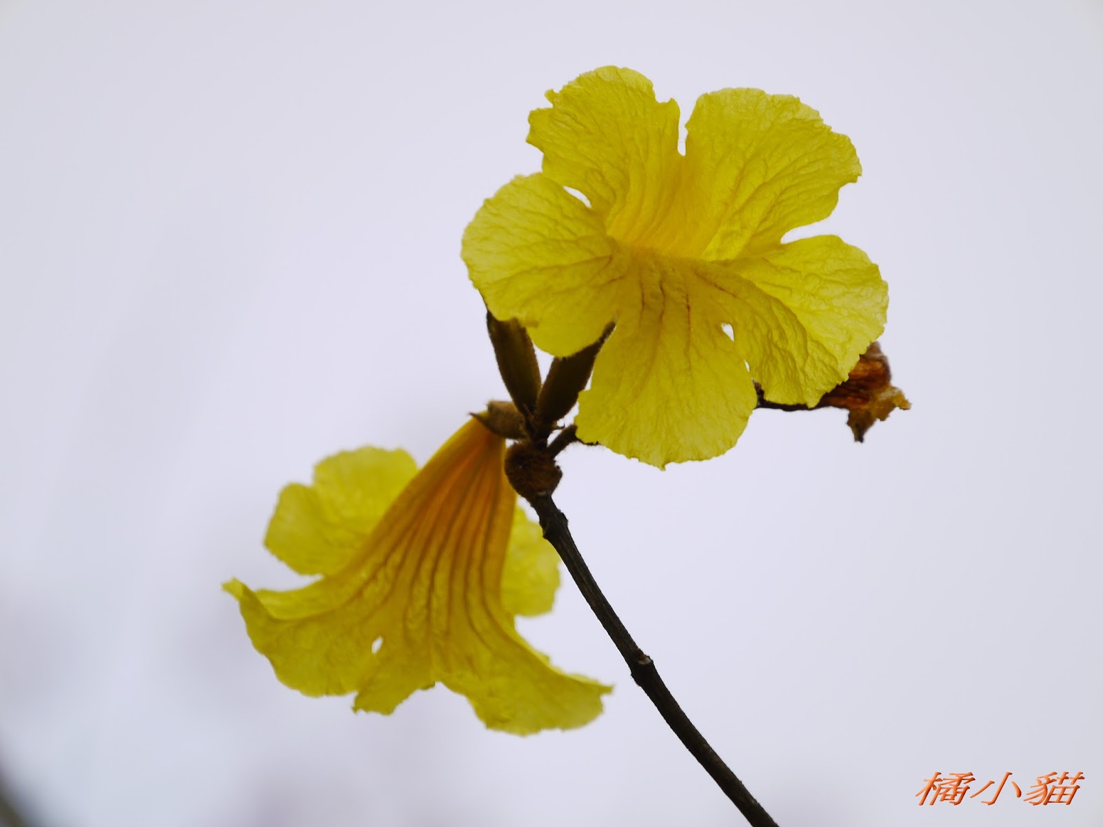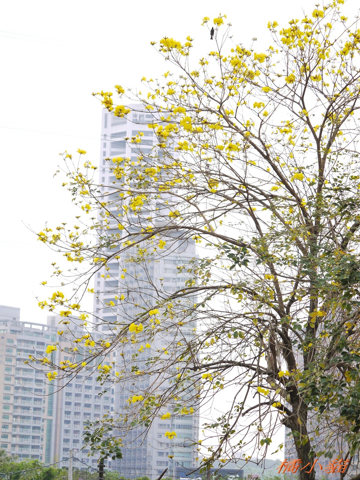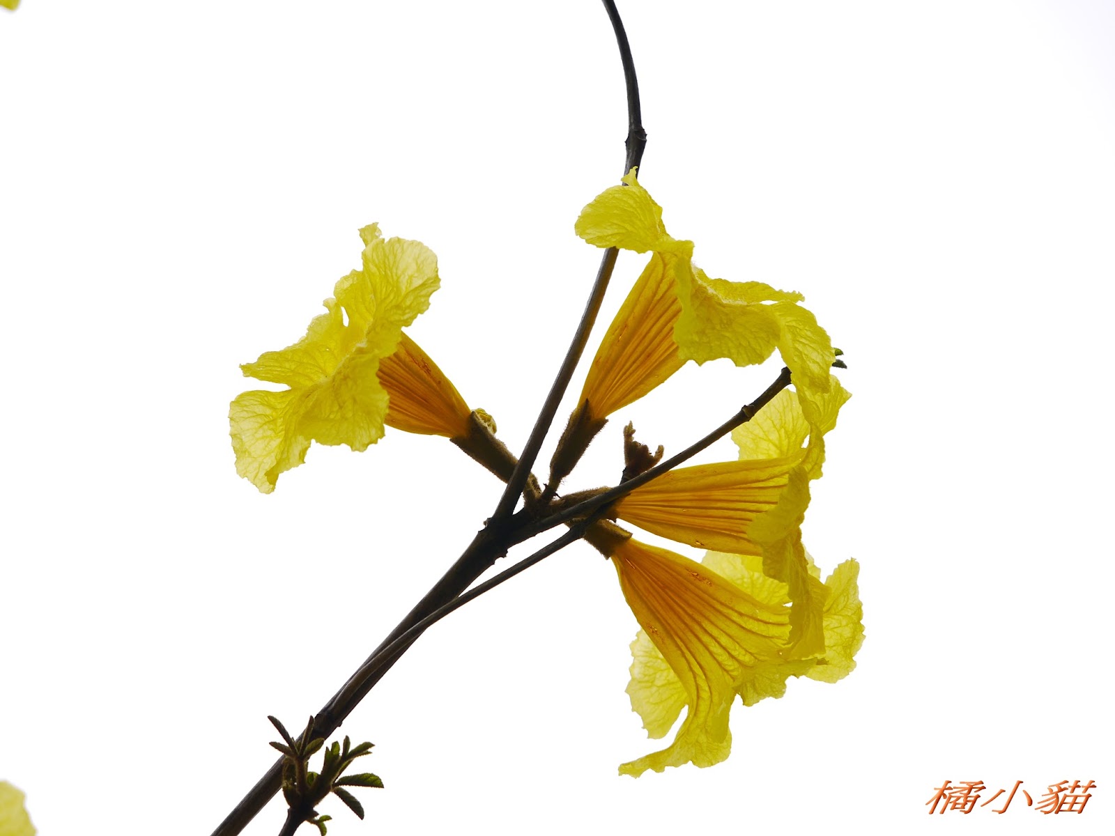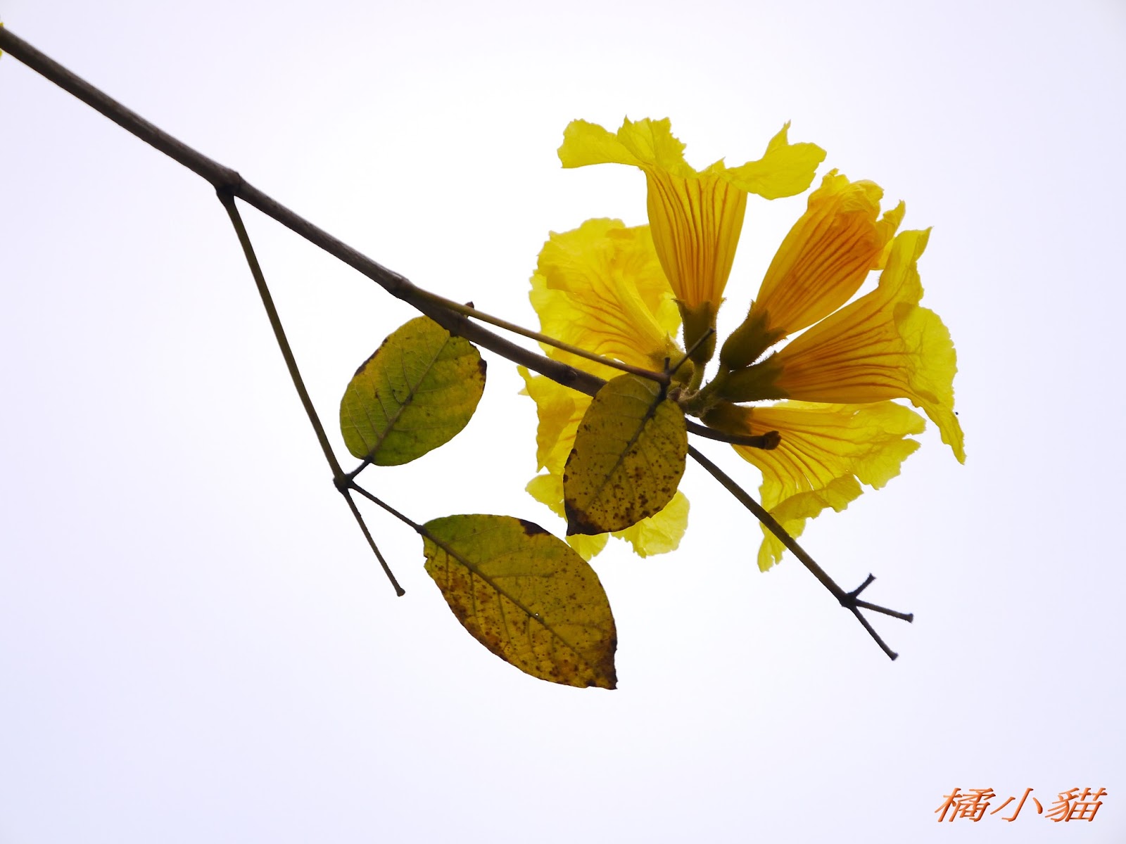 我前幾天路過淡水某條路,也看到一棵無葉只有花的黃花風鈴木,不很大棵~~
