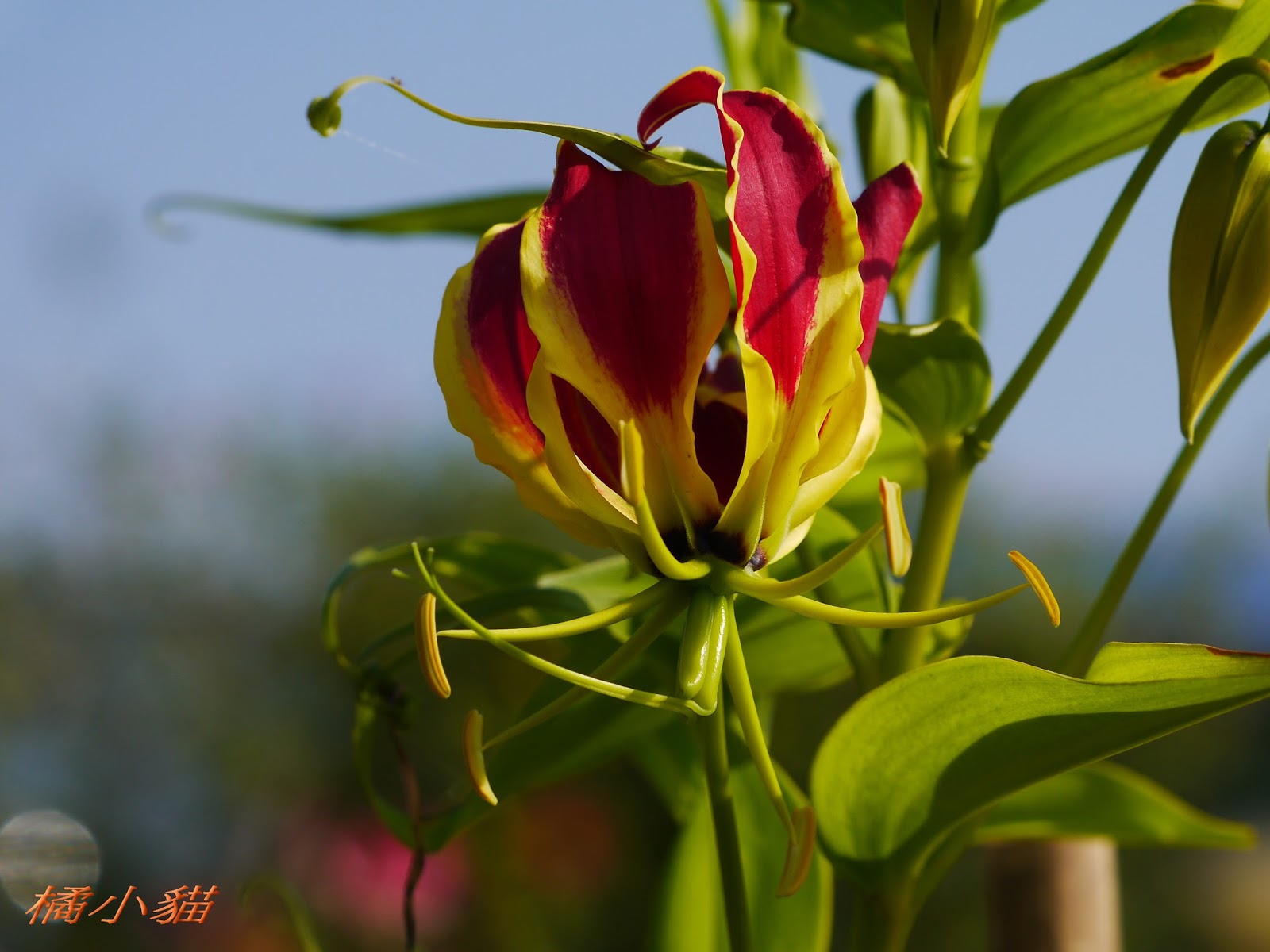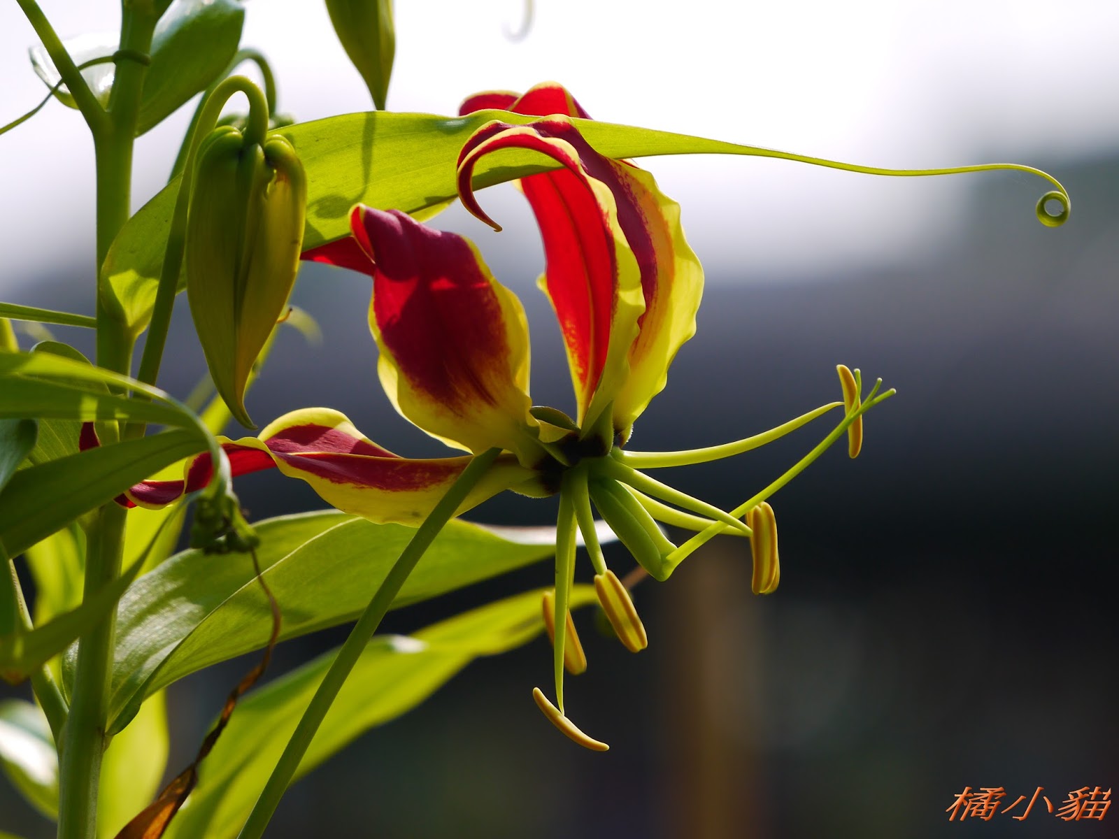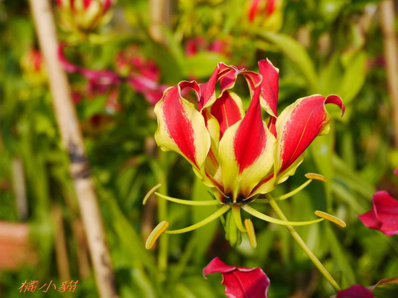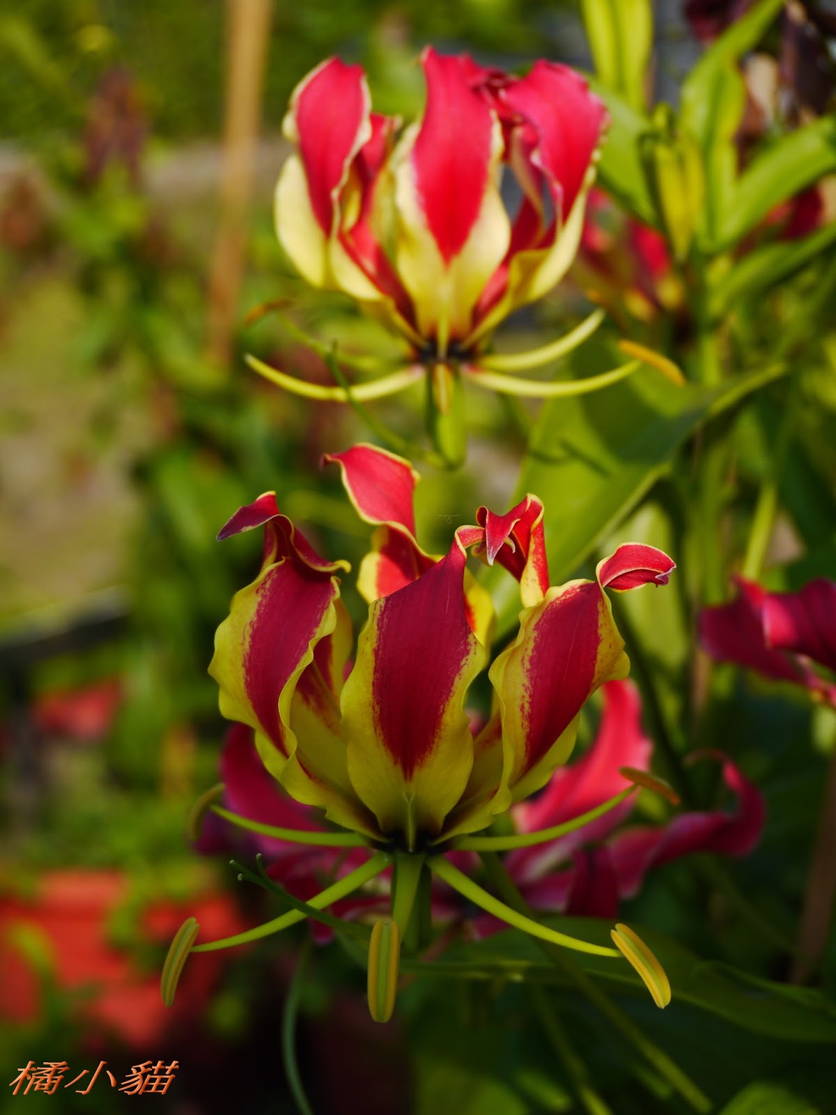 學名:Gloriosa rothschildiana O'Brien 科別:Liliaceae 百合科 又稱:嘉蘭百合、火焰百合、印度百合、蔓百合、戰勝葛、鐵線雞爪 花期:夏至秋季開花 瓶插壽命:七~十天 特性:原產地在熱帶亞洲,多年生球根花卉,花色下部為黃色,上部為紅色。花絲細長、花藥著生於一點,迎風搖動,產色華麗,甚受歡迎。 花語:頑強、光榮、榮耀