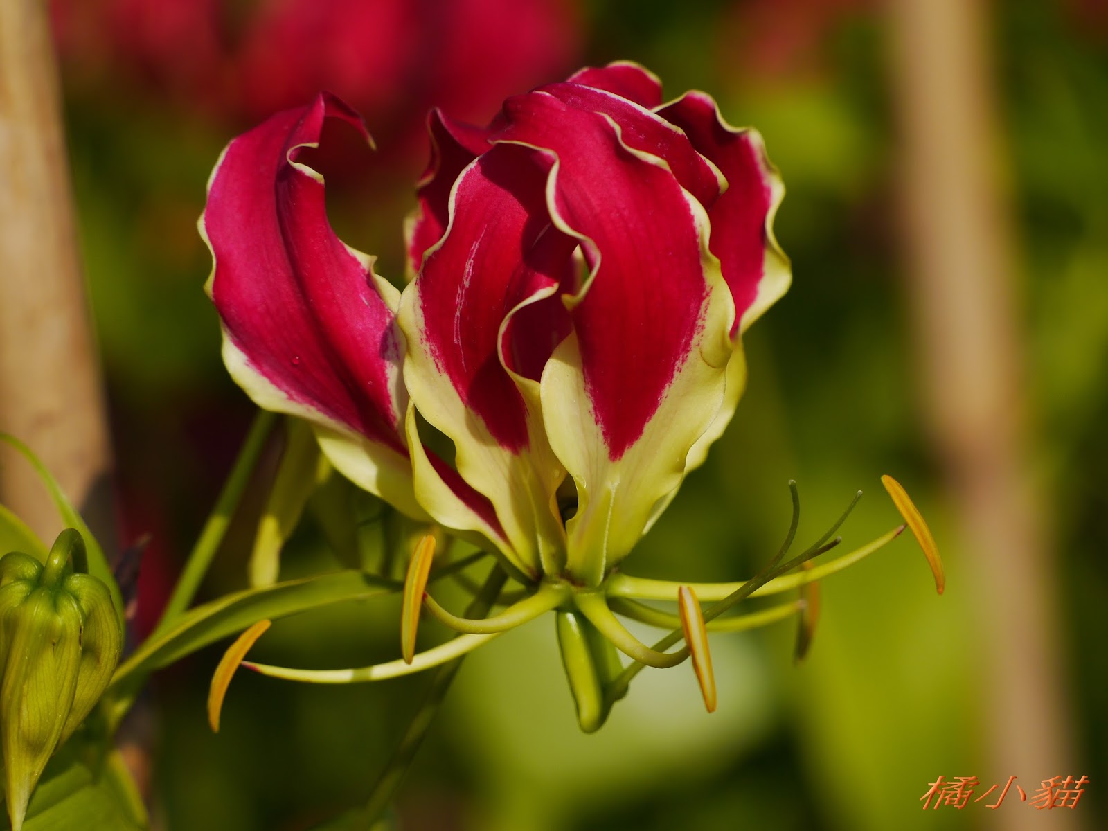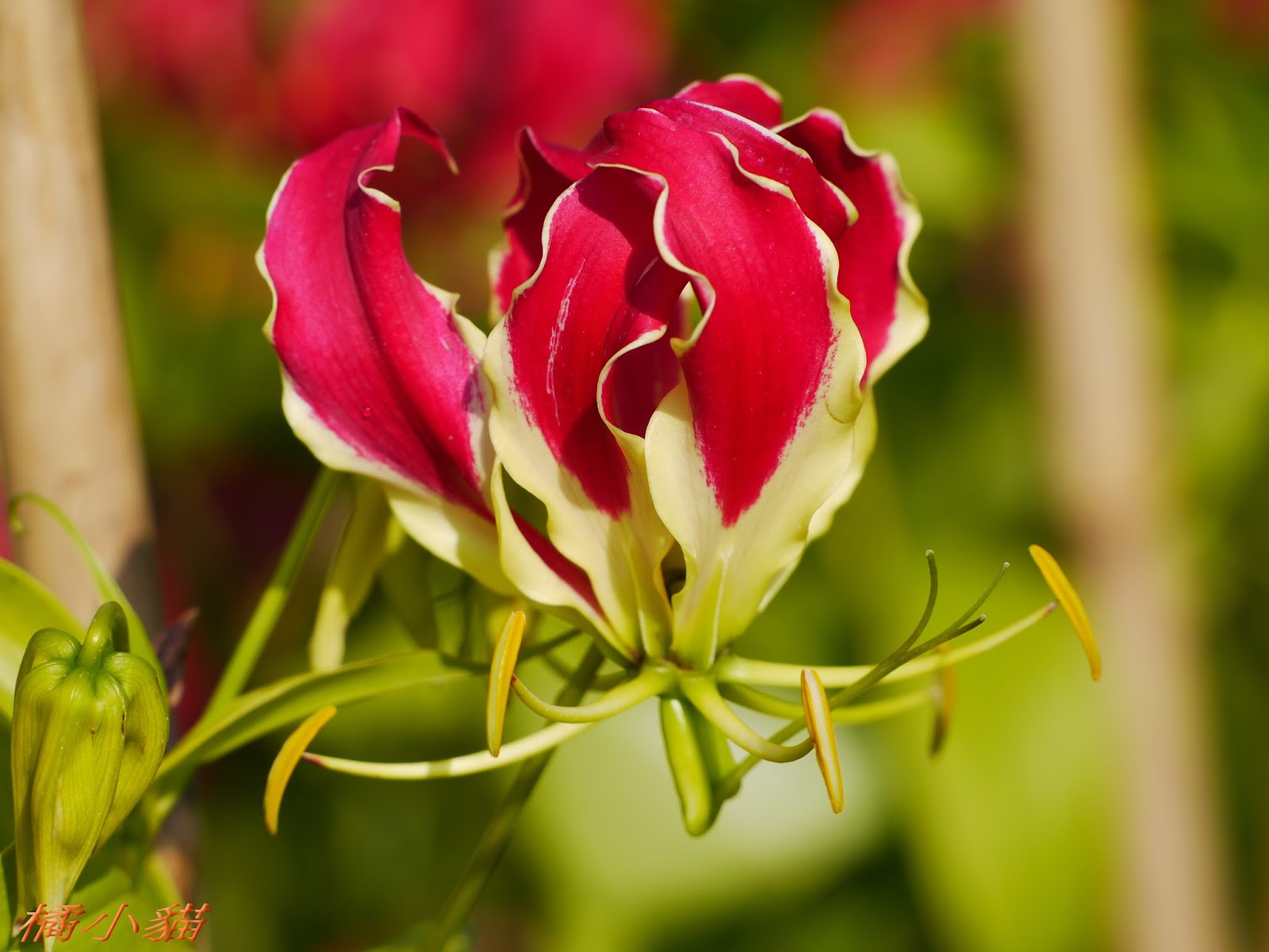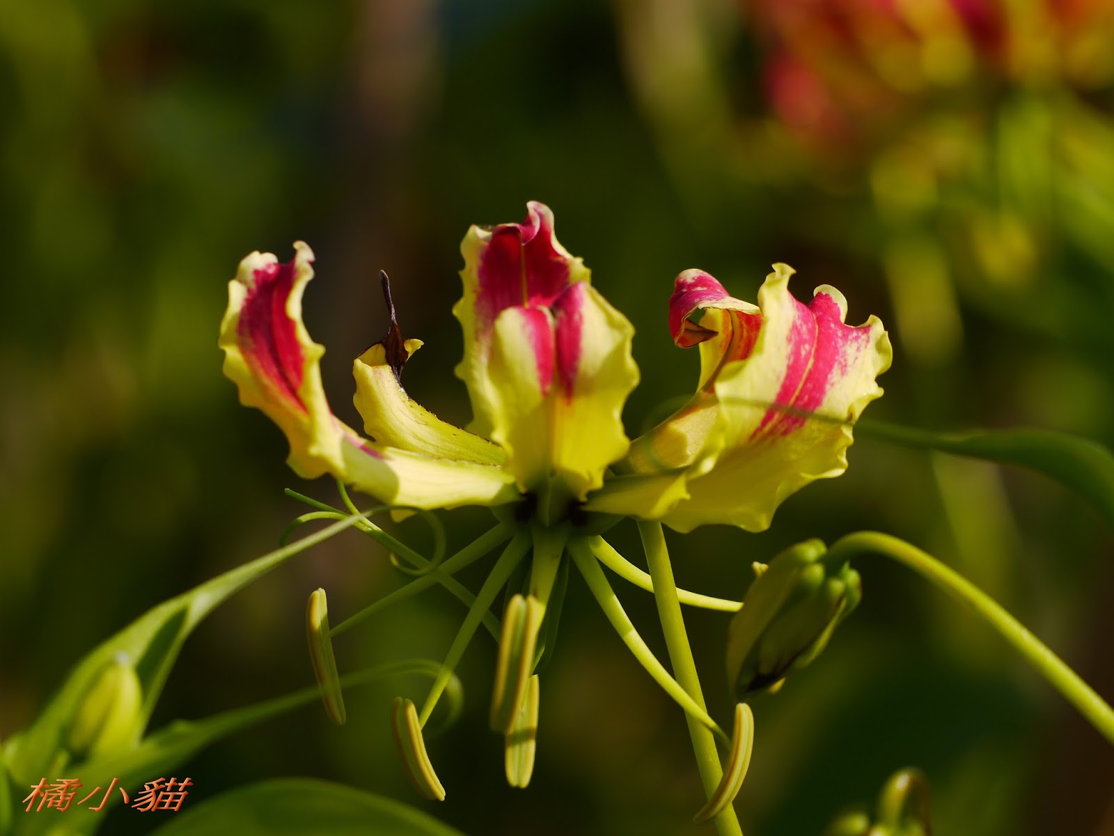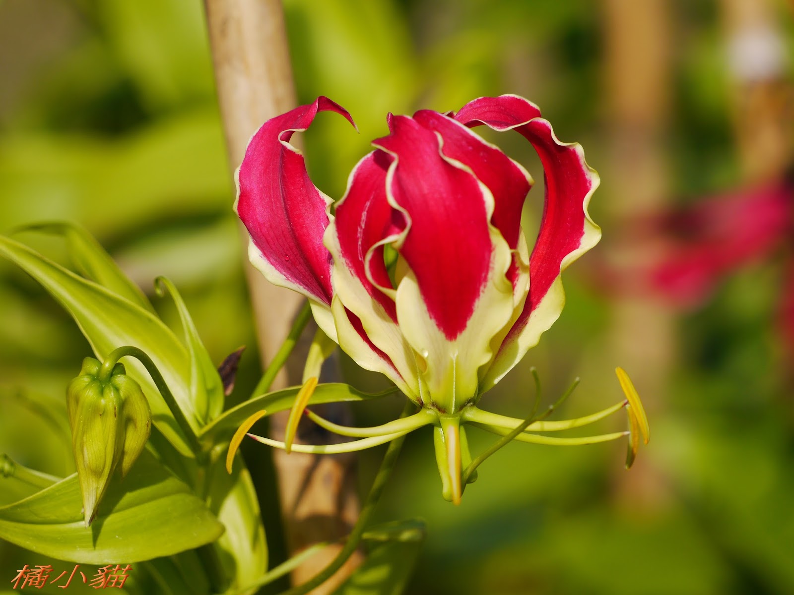 學名:Gloriosa rothschildiana O'Brien 科別:Liliaceae 百合科 又稱:嘉蘭百合、火焰百合、印度百合、蔓百合、戰勝葛、鐵線雞爪 花期:夏至秋季開花 瓶插壽命:七~十天 特性:原產地在熱帶亞洲,多年生球根花卉,花色下部為黃色,上部為紅色。花絲細長、花藥著生於一點,迎風搖動,產色華麗,甚受歡迎。 花語:頑強、光榮、榮耀