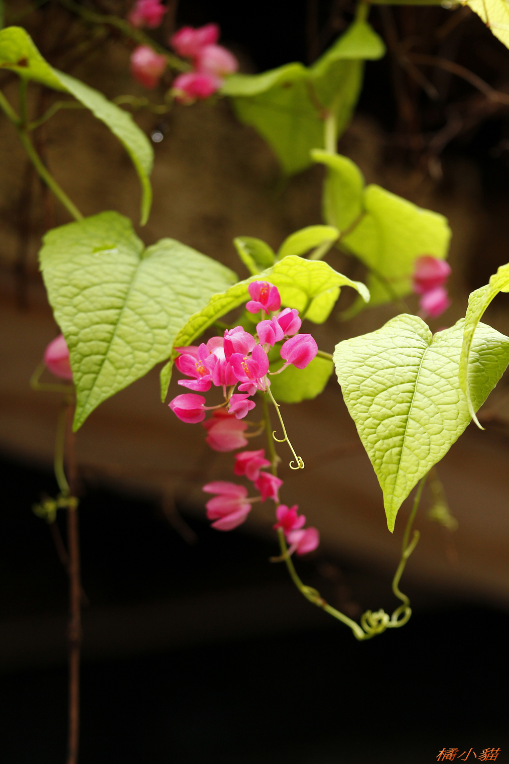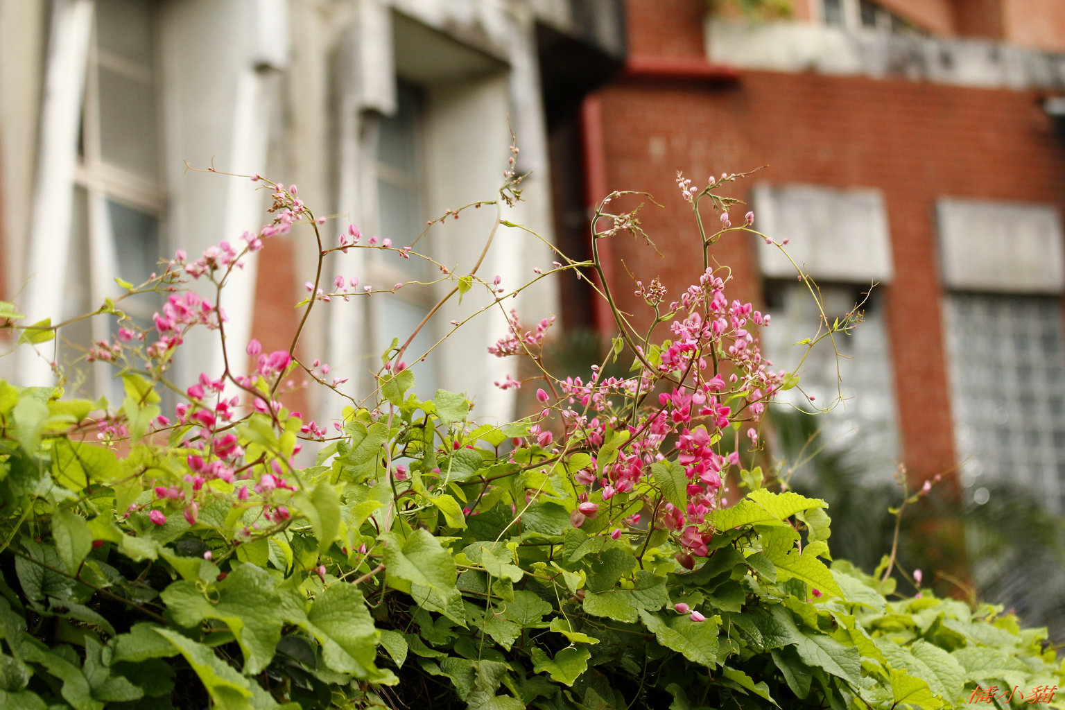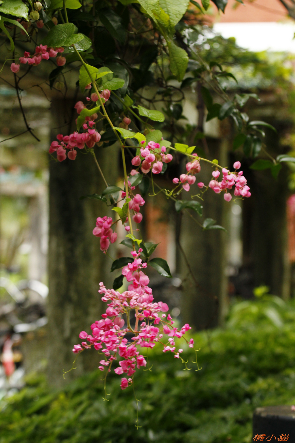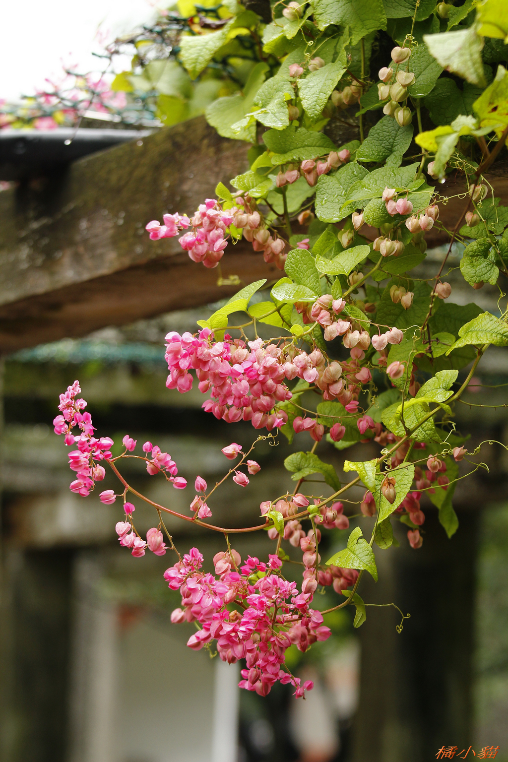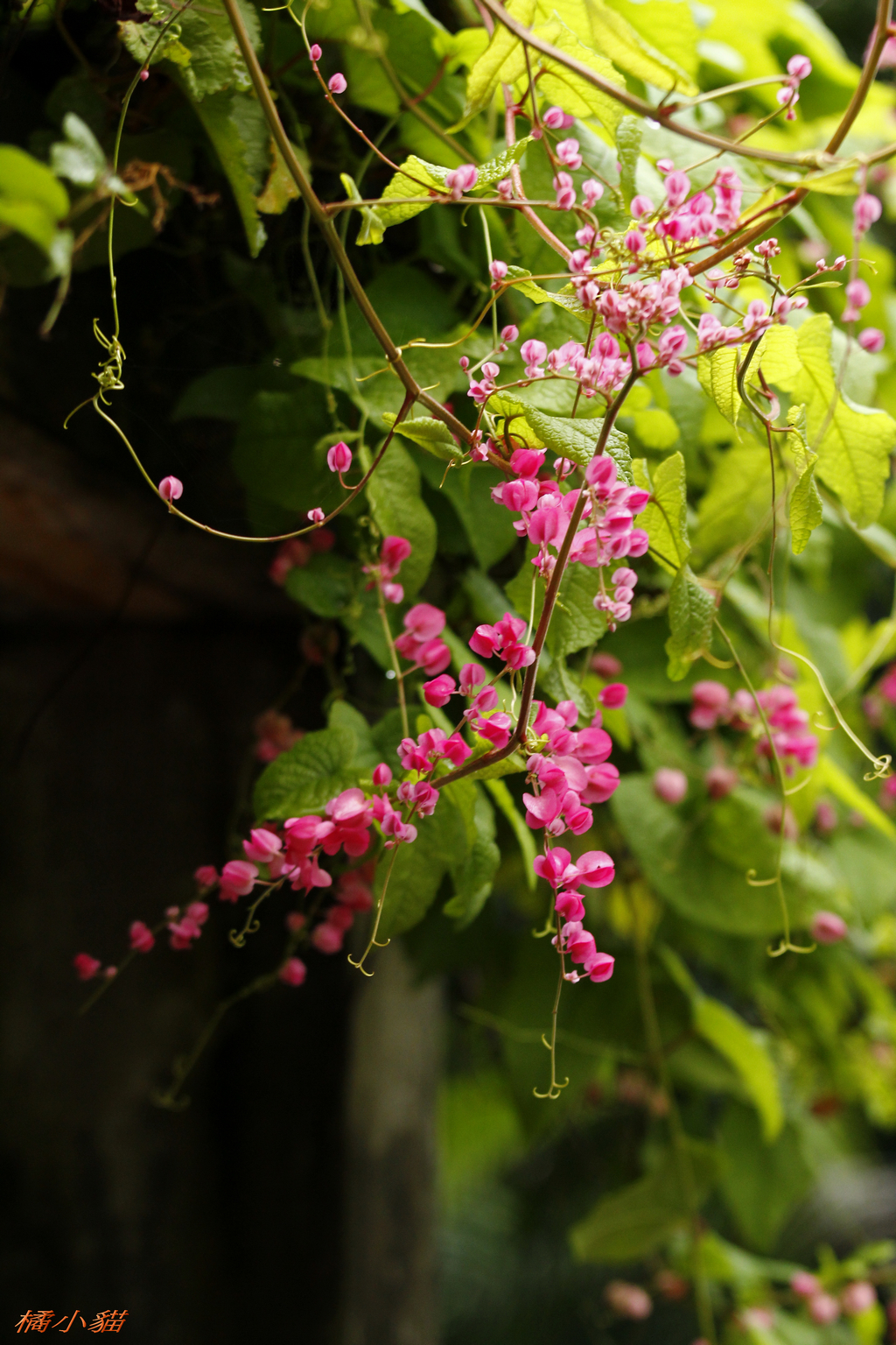 從小就對珊瑚藤印象深刻 附近有戶人家將珊瑚藤種在牆邊 它爬滿了瓦質屋頂 開花時節 除了滿屋頂的粉紅 還會垂掛下來 相當美麗~~