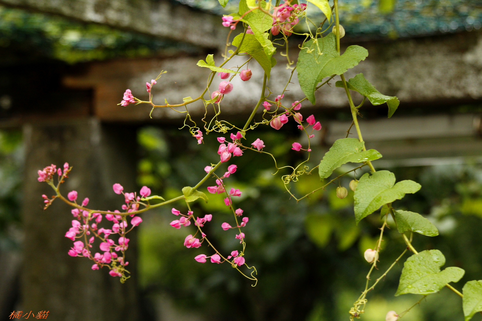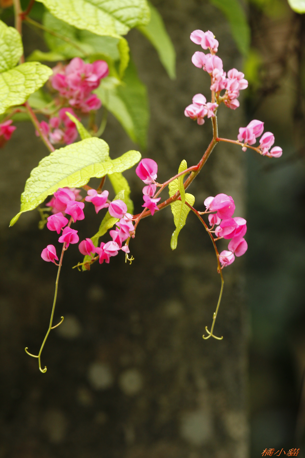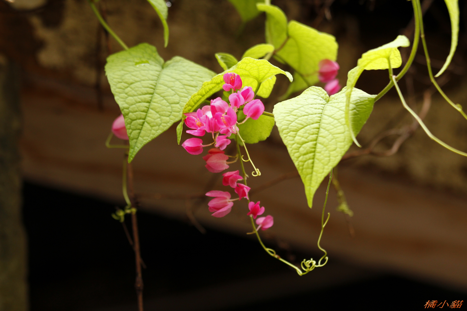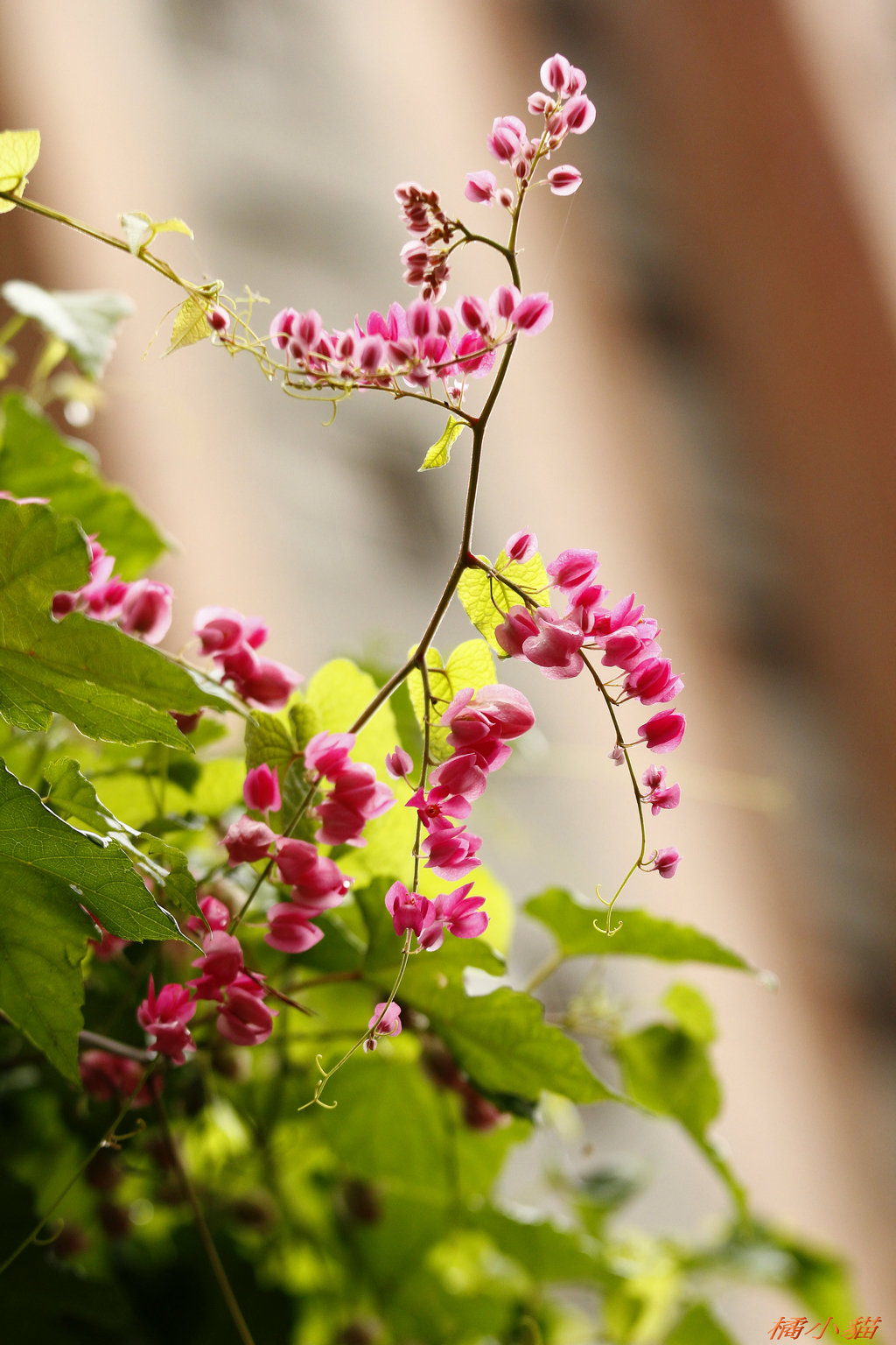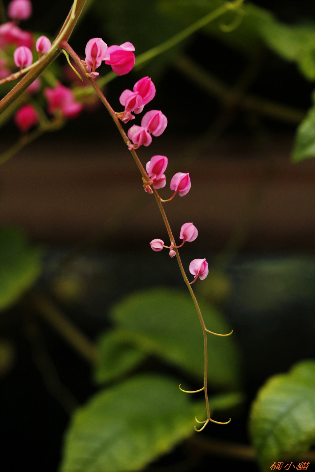 從小就對珊瑚藤印象深刻 附近有戶人家將珊瑚藤種在牆邊 它爬滿了瓦質屋頂 開花時節 除了滿屋頂的粉紅 還會垂掛下來 相當美麗~~