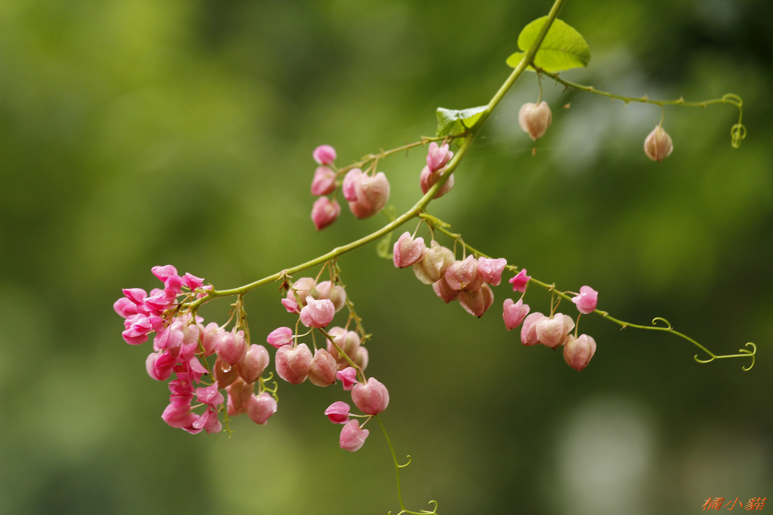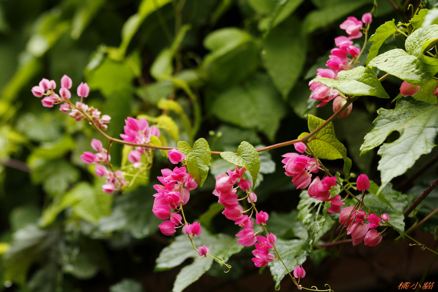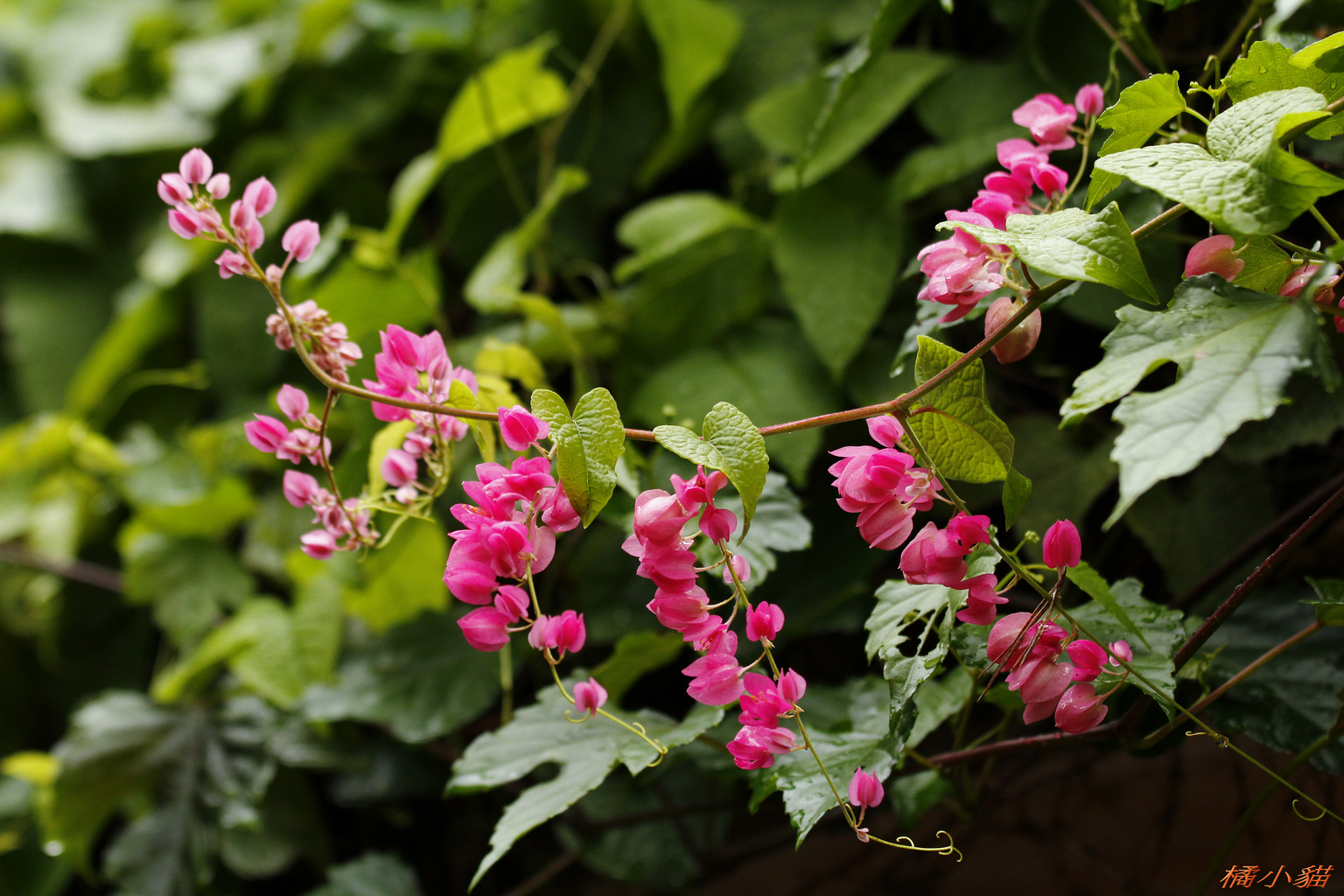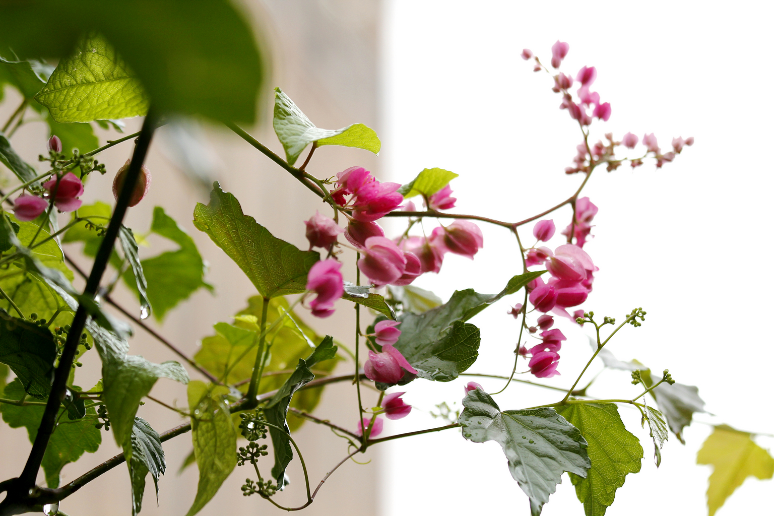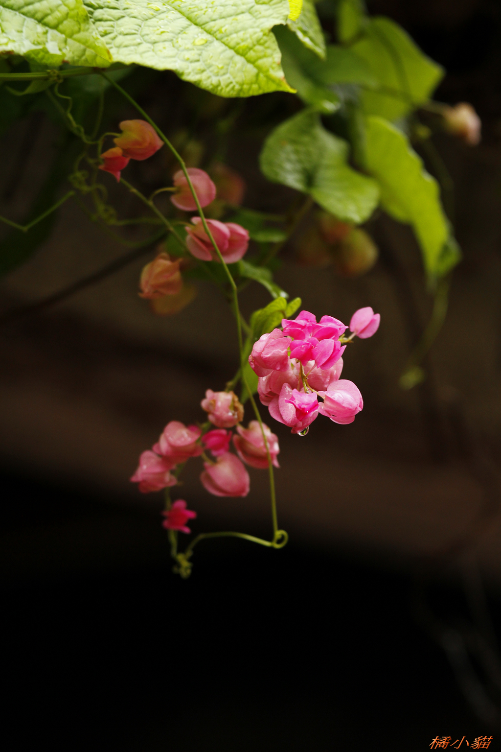 從小就對珊瑚藤印象深刻 附近有戶人家將珊瑚藤種在牆邊 它爬滿了瓦質屋頂 開花時節 除了滿屋頂的粉紅 還會垂掛下來 相當美麗~~