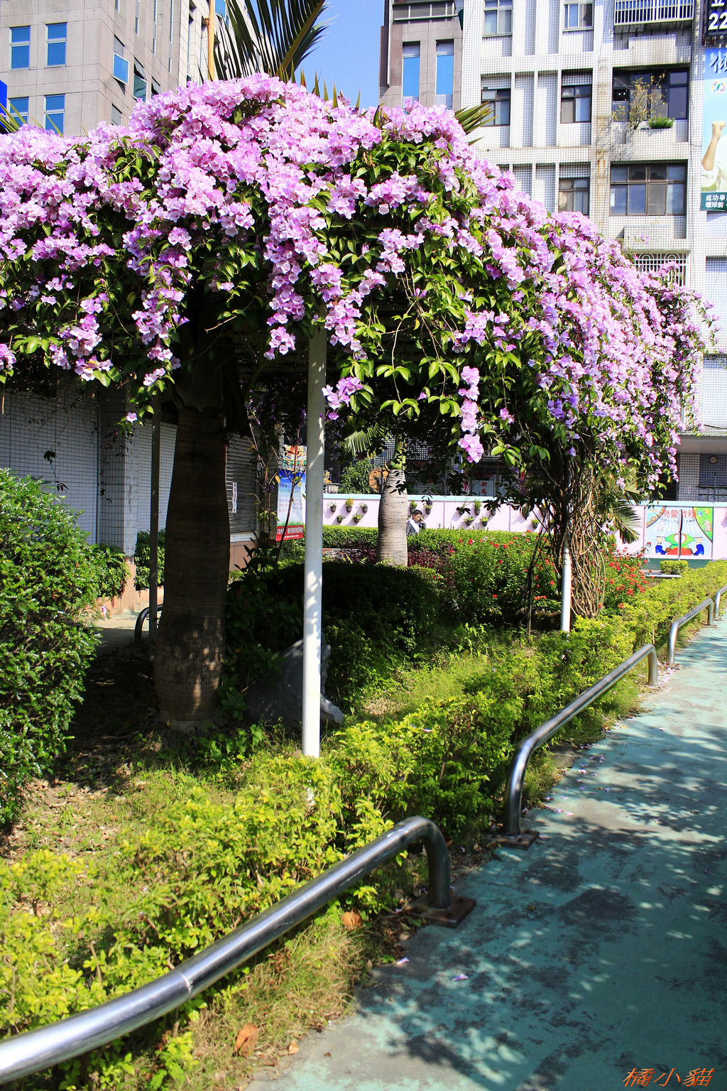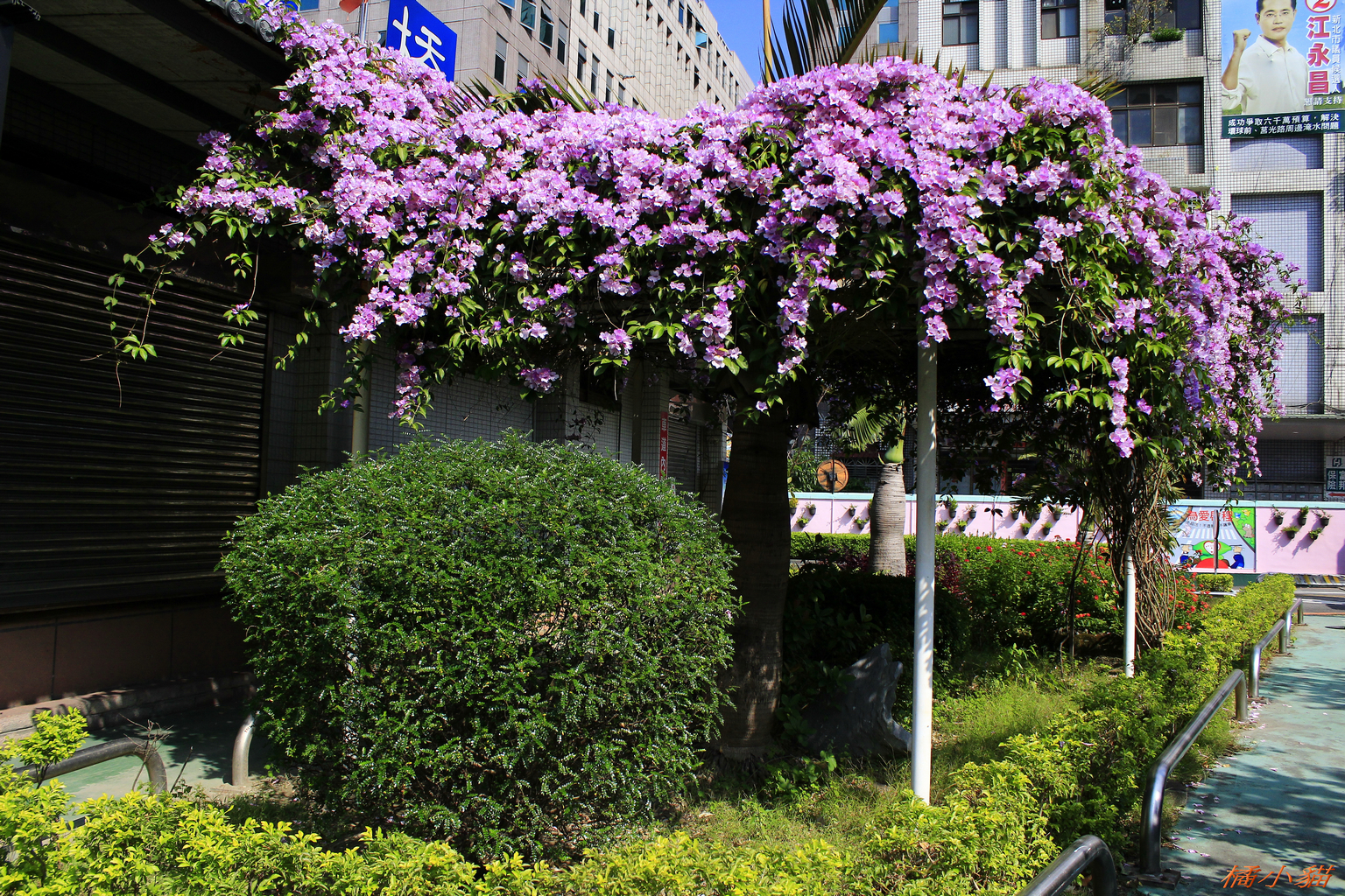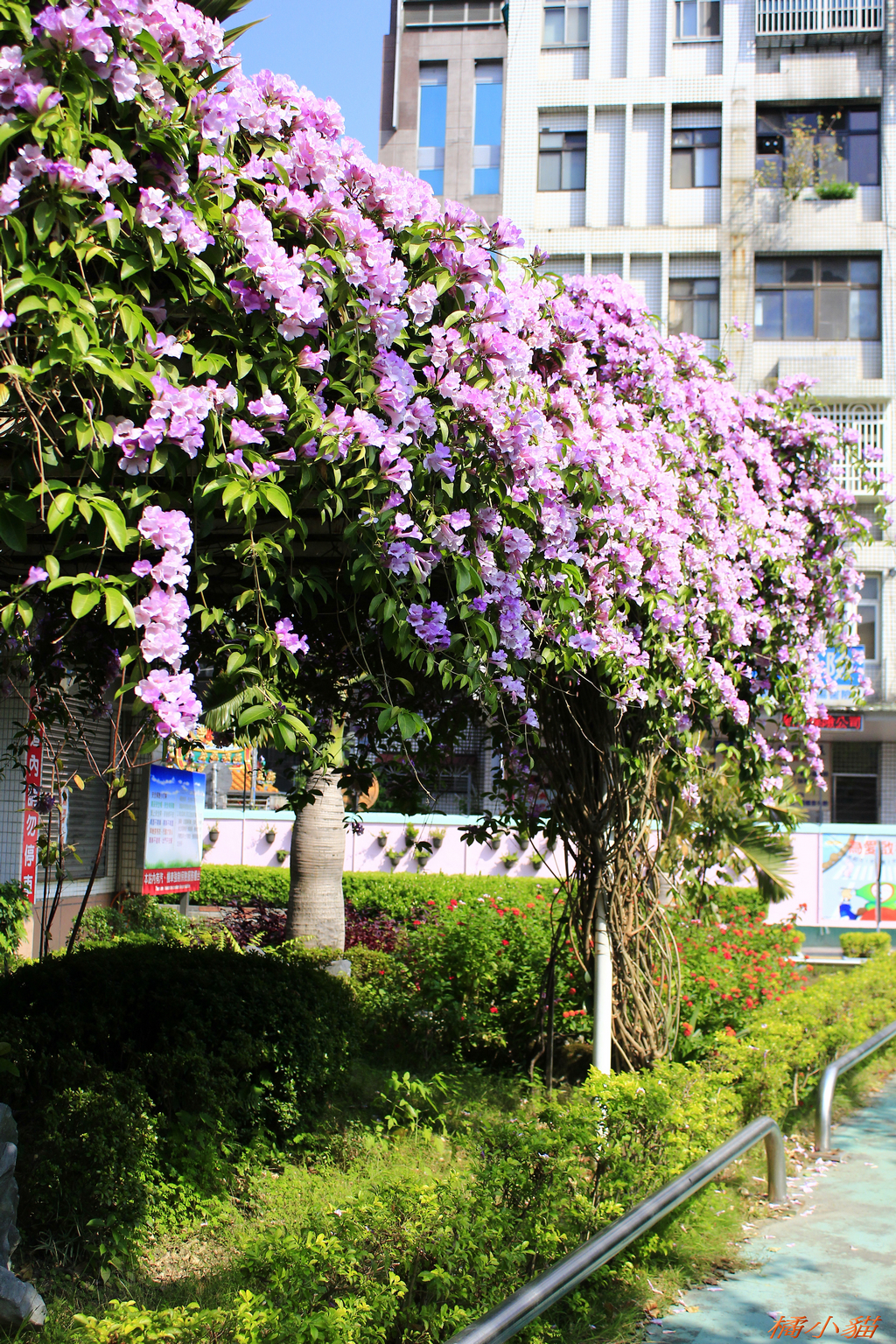 午安!好大一棵的蒜香藤 勘滿紫色的花,路過的人都會忍不住停下來觀賞吧! a 滿開的蒜香藤很壯美喔