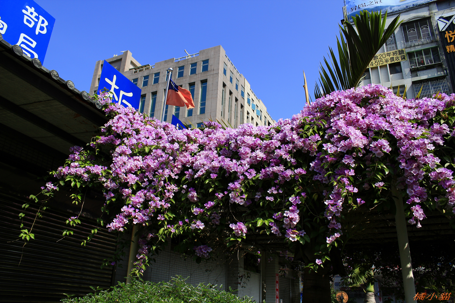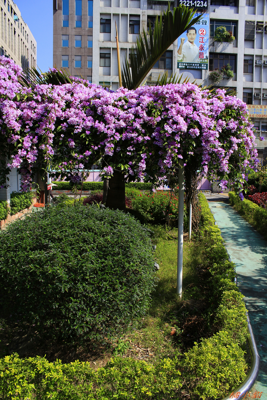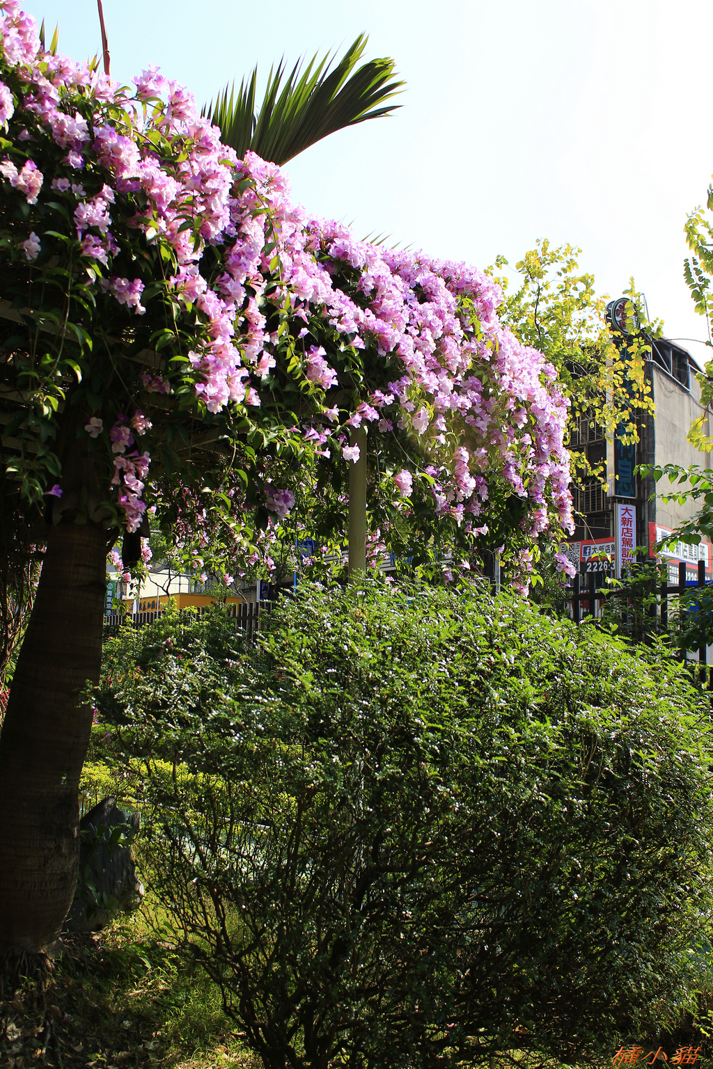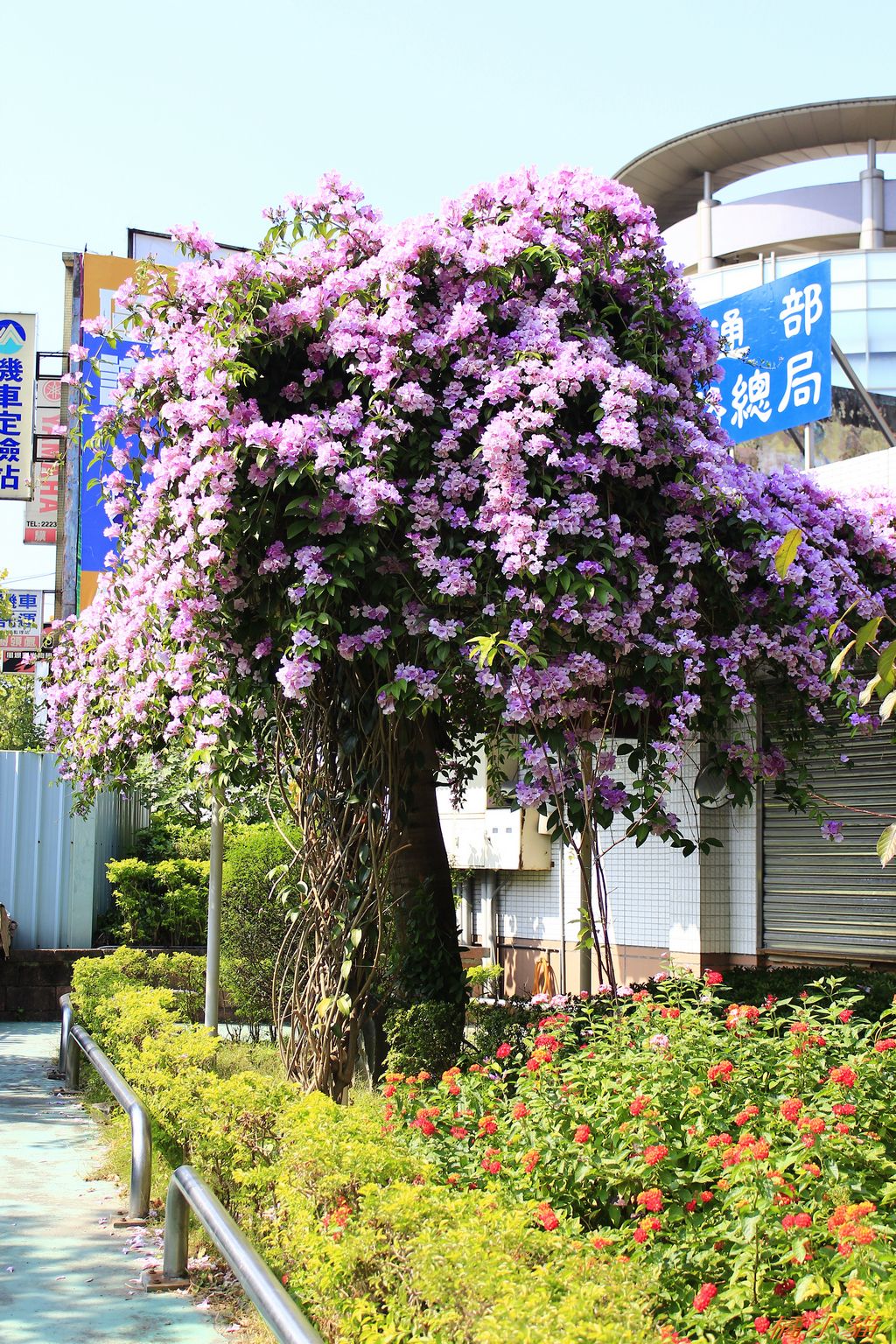 午安!好大一棵的蒜香藤 勘滿紫色的花,路過的人都會忍不住停下來觀賞吧! a 滿開的蒜香藤很壯美喔