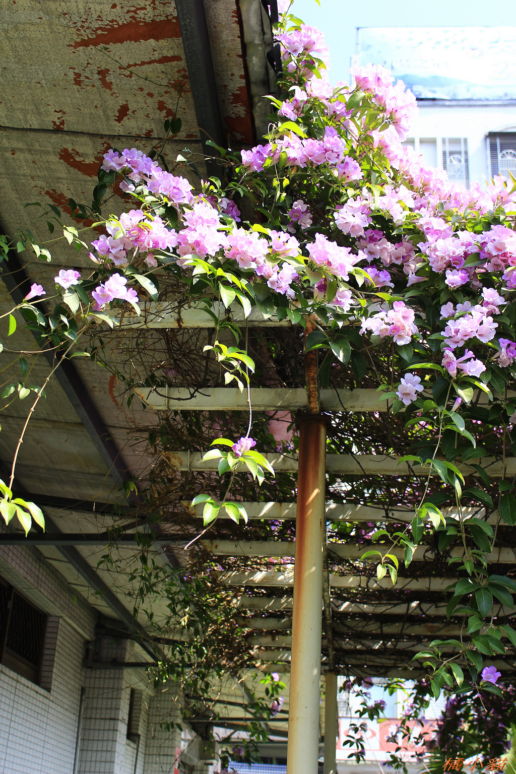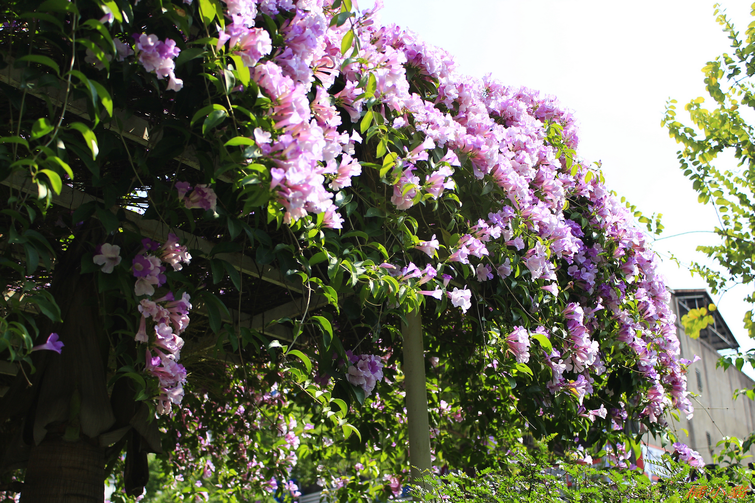 這一棚架子的蒜香藤,還盛開著真滿,紫色的夢幻~拍的真是美